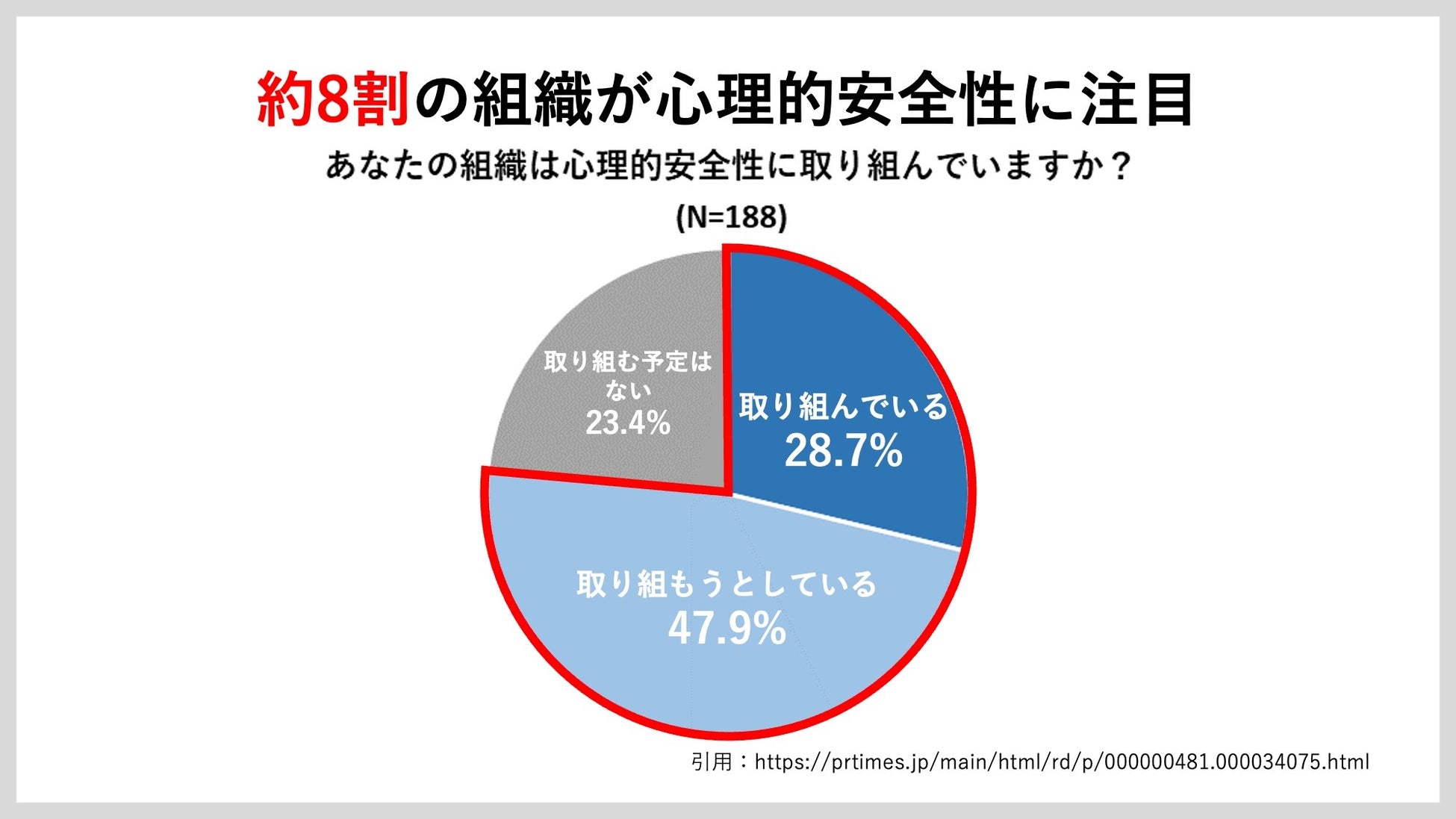 心理的安全性に関する調査では、多くの企業が心理的安全性向上への取り組みを行っている、または検討している状況が明らかになっています。