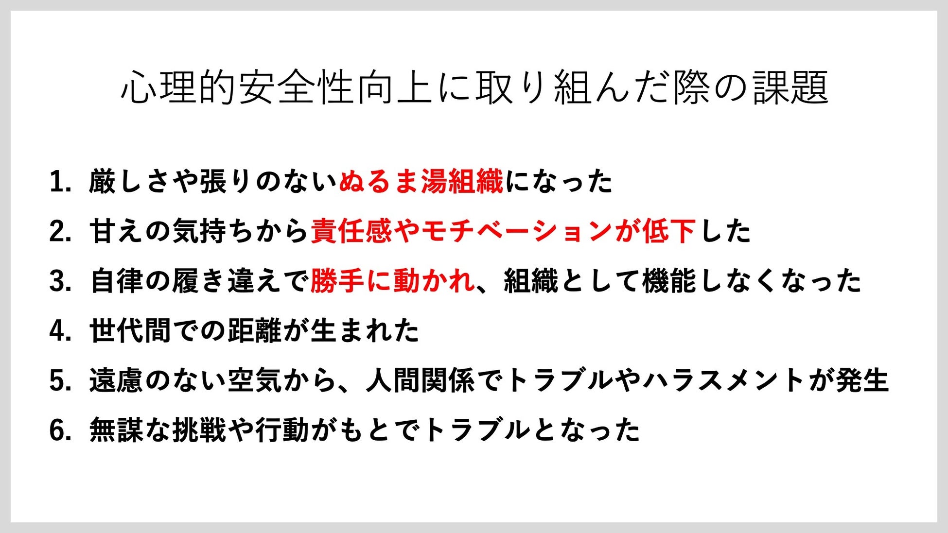 しかし一方で、職場の心理的安全性向上に向けた取り組みを行った結果、逆に課題が浮上している企業もあるようです。