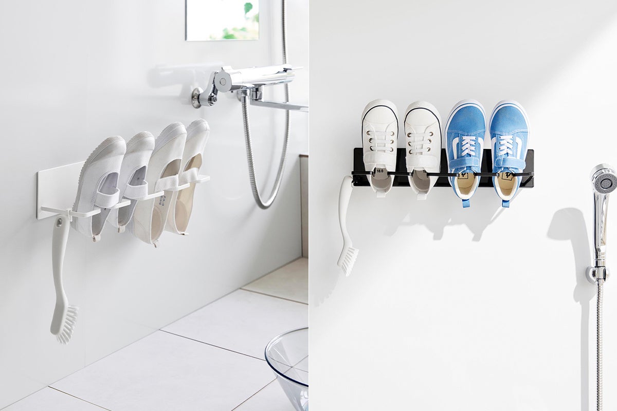 マグネットでバスルームの壁に簡単に取り付けられるシューズハンガーです。