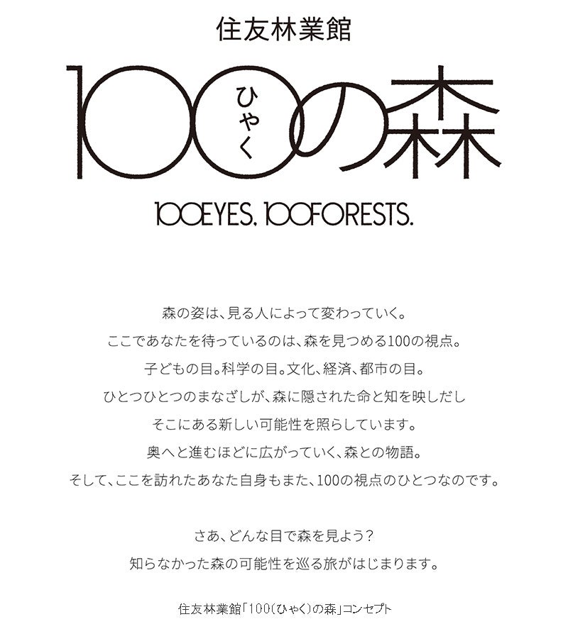 住友林業館「100(ひゃく)の森」は「100EYES, 100FORESTS.」をコンセプトに、木と森を多角的な視点から見つめる体験を提供します。住友林業グループは1691年の創業以来、「木」を軸に事業を展開し、森を守ることと、自然資本として活用すること、その両方に多様な視点で取り組んできました。「100EYES, 100FORESTS.」には、「森の姿は、見る人によって変わっていく、多くの可能性を秘めている」というメッセージが込められています。