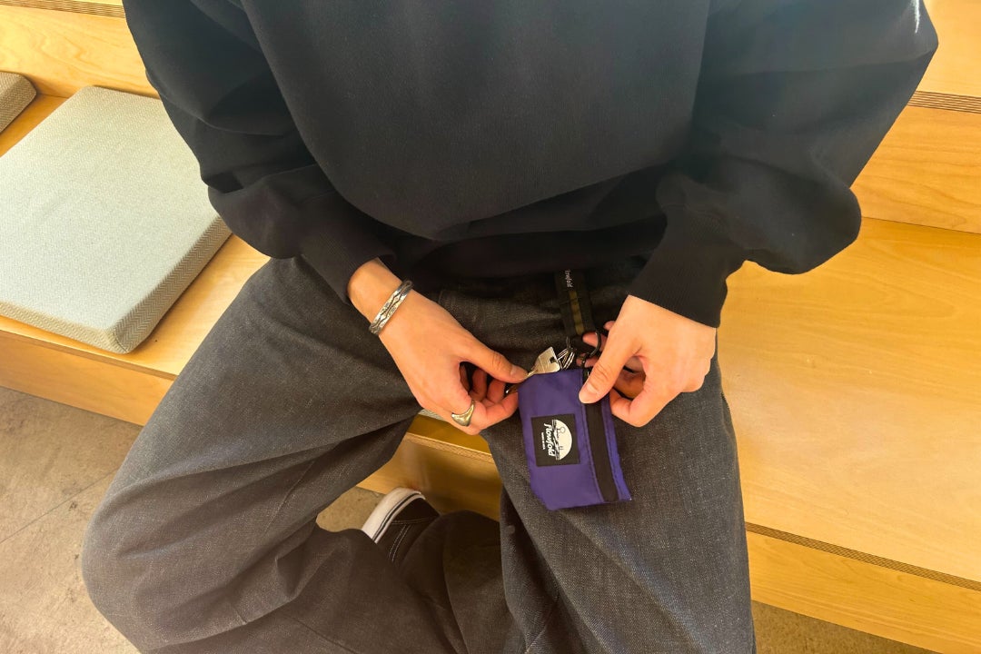 ポーチや鍵を付けて、スナップフックでカバンやボトムスのベルトループに装着。