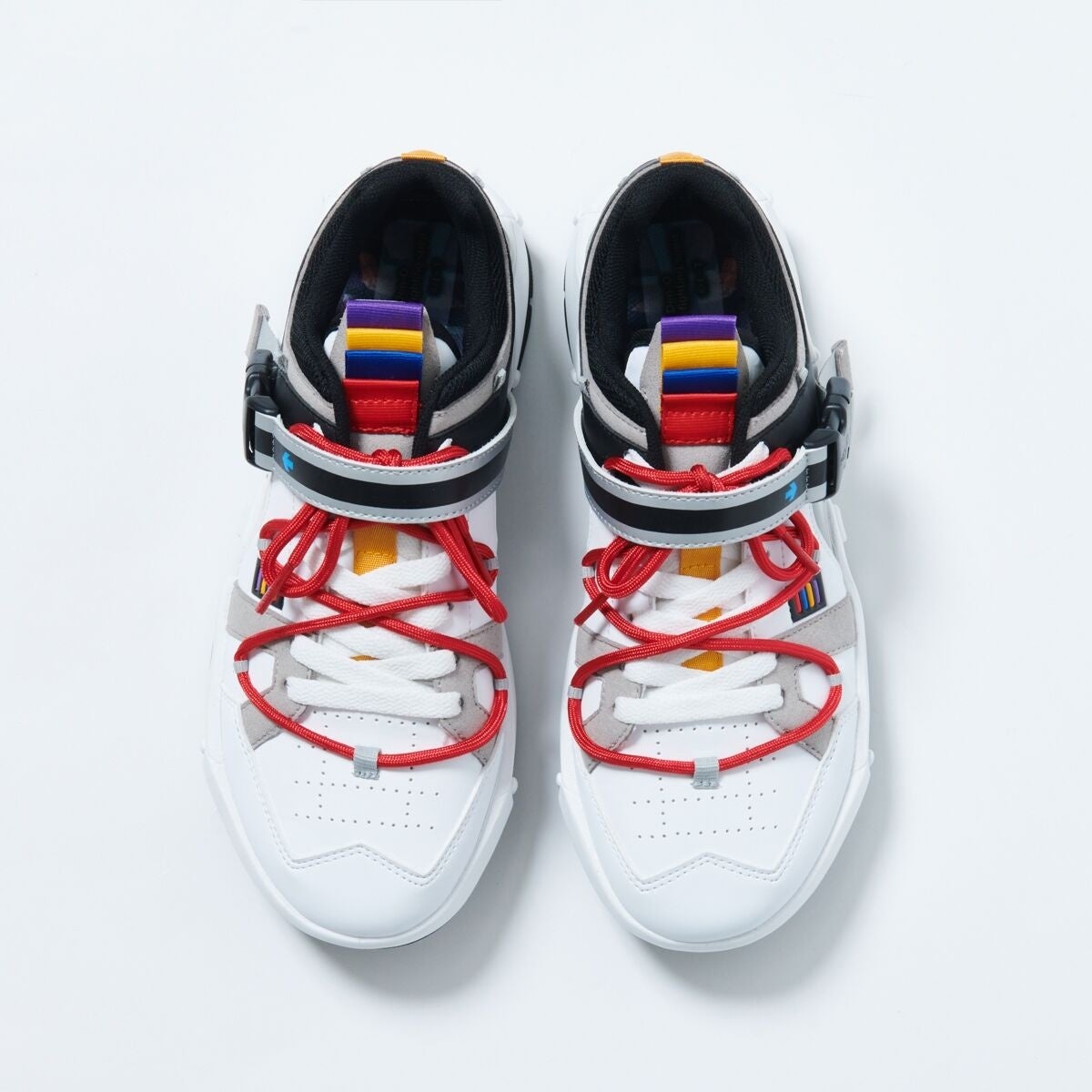 白を基調としたベーシックなデザインのスニーカーをベースに、それぞれ特徴を持った4色のシューレースの付け替えで、仮面ライダー電王の「ソードフォーム」「ロッドフォーム」「アックスフォーム」「ガンフォーム」の4フォームに加えて、シューレースを外すことで「プラットフォーム」、4本すべてのシューレースをつけることで「クライマックスフォーム」も再現することが可能です。