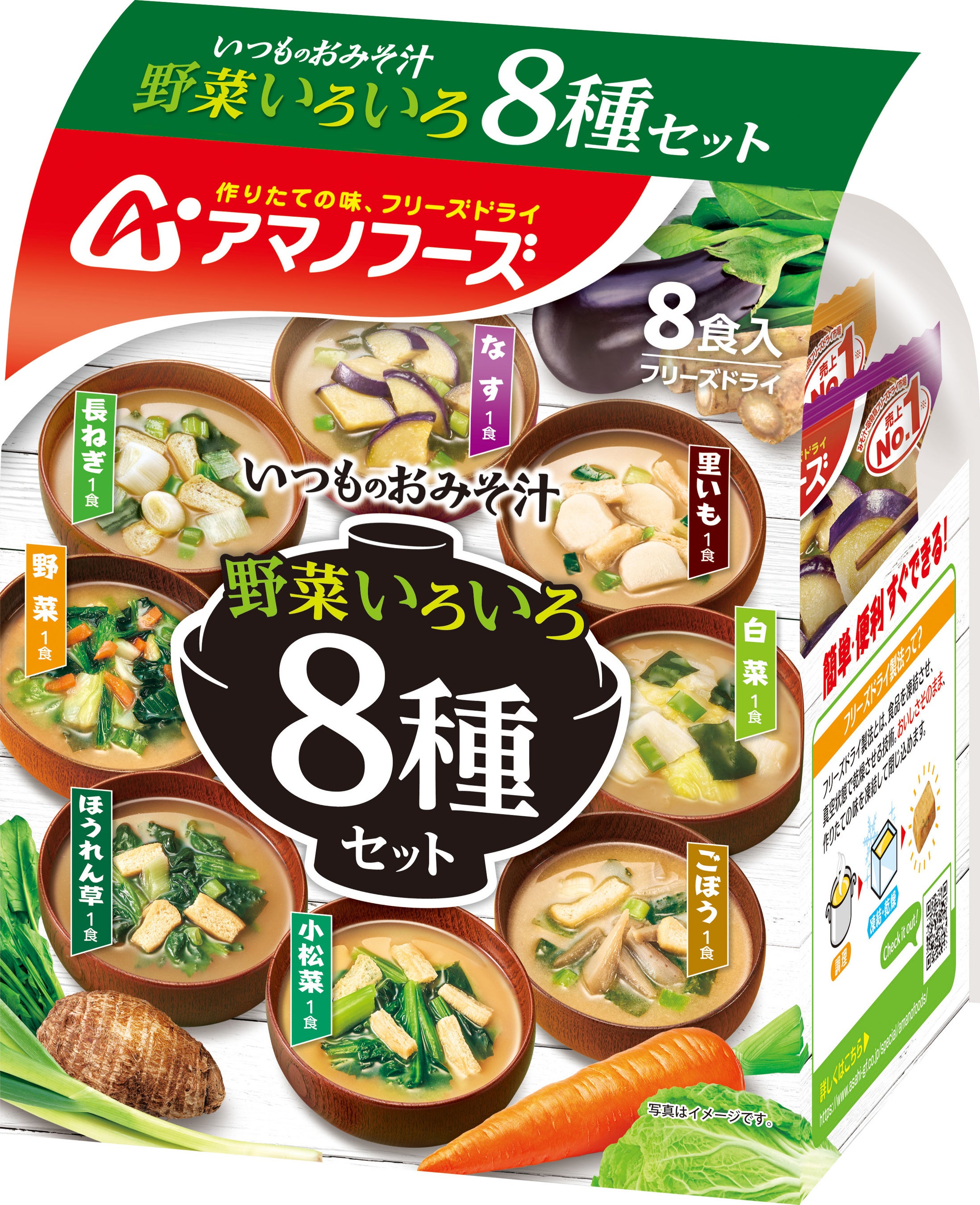 「いつものおみそ汁」シリーズの中で野菜の具材だけを集めたバリエーション豊かな商品です。なす・⾧ねぎ・野菜・ほうれん草・小松菜・ごぼう・白菜・里いも各1食入りで、手軽においしくいろいろな種類の野菜をとることが出来る、便利な8種セットです。