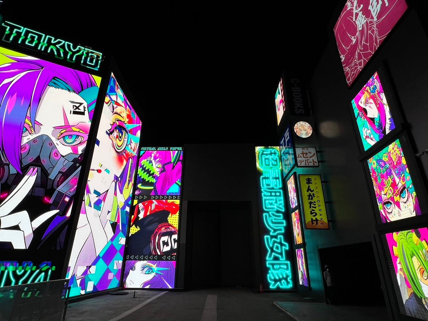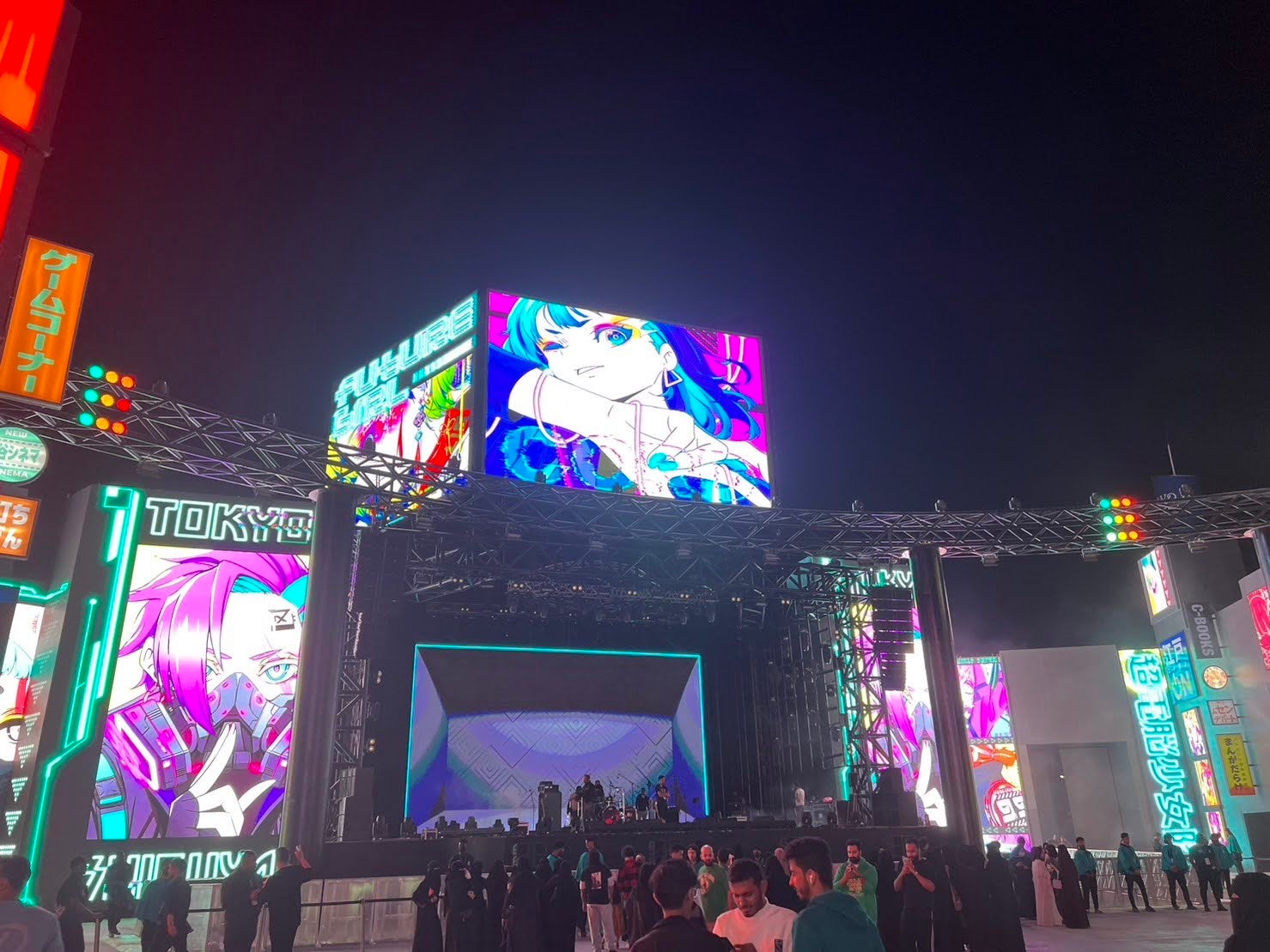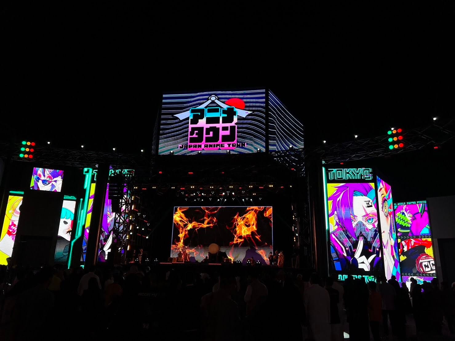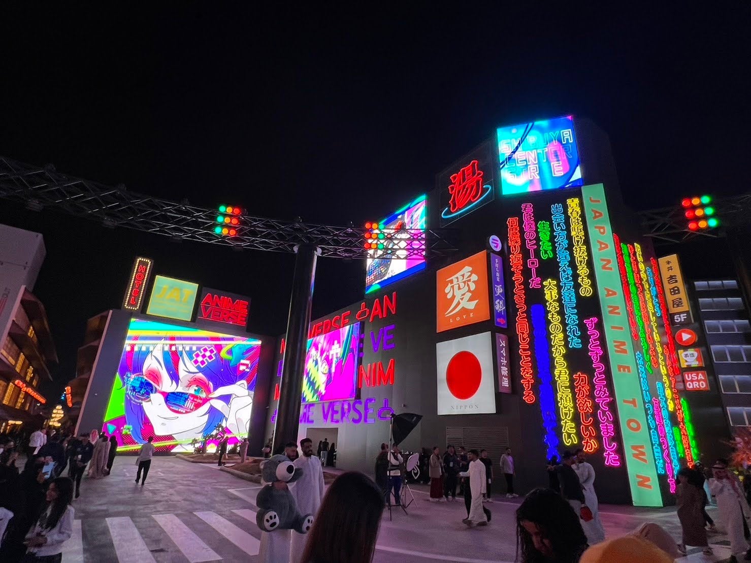 ジャパンアニメタウンにおいては、イベントの主催団体でもあるサウジアラビア政府の強い希望により、同国内でも人気を博するアニメなど日本のエンタメカルチャー体験パビリオンが作られた。先述の通り約40,000平方メートルにも及ぶエリアには23社、29のIPが出展している。会場内ではアニメなど各種IP展示ブースやコンテンツ上映の他、渋谷のスクランブル交差点や東京タワー、浅草の仲見世通りや京都の伏見稲荷など、いずれも日本を代表する観光地をイメージした施設が立ち並んでいる。