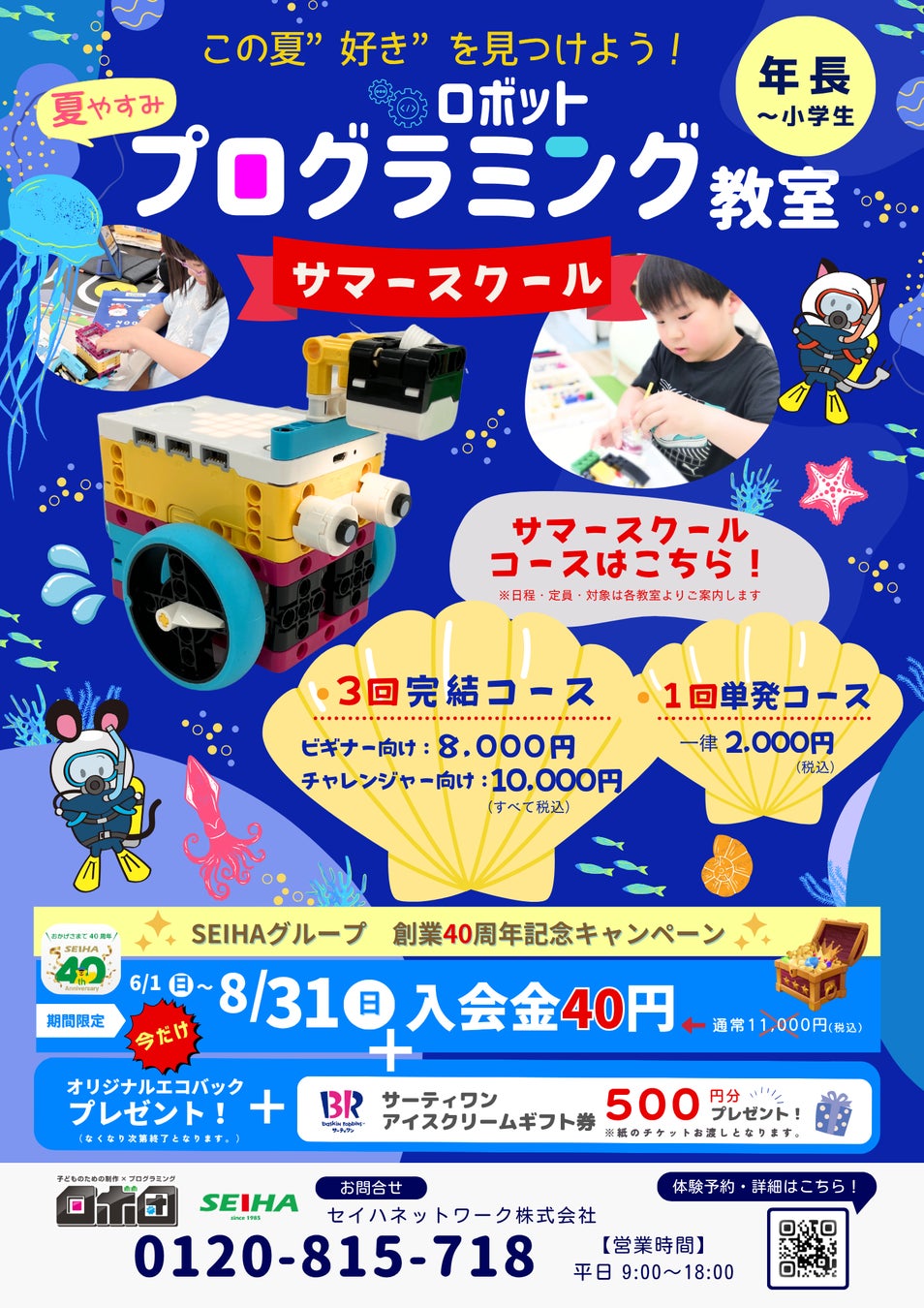 セイハネットワーク株式会社(福岡県福岡市,代表取締役:坂口 正美,以下セイハネットワーク)が展開するプログラミング教室「ロボ団」では、創業40周年を記念した「夏のキャンペーン」を、実施中です。夏のキャンペーンでは、専用のロボット教材を使って、遊びながら自然にプログラミング的思考や課題解決力を育むことができる内容となっており、初めてのお子さまでも安心して楽しく学べる設計です。
