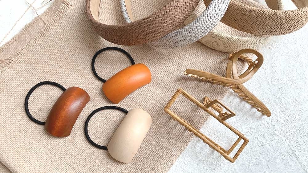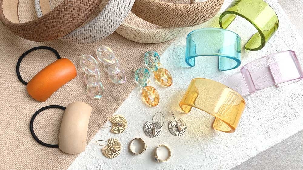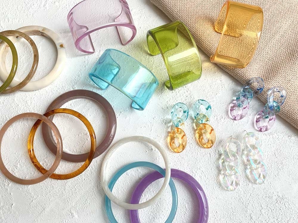 カラフルなクリア素材のバングル、ジュート素材のカチューシャ、