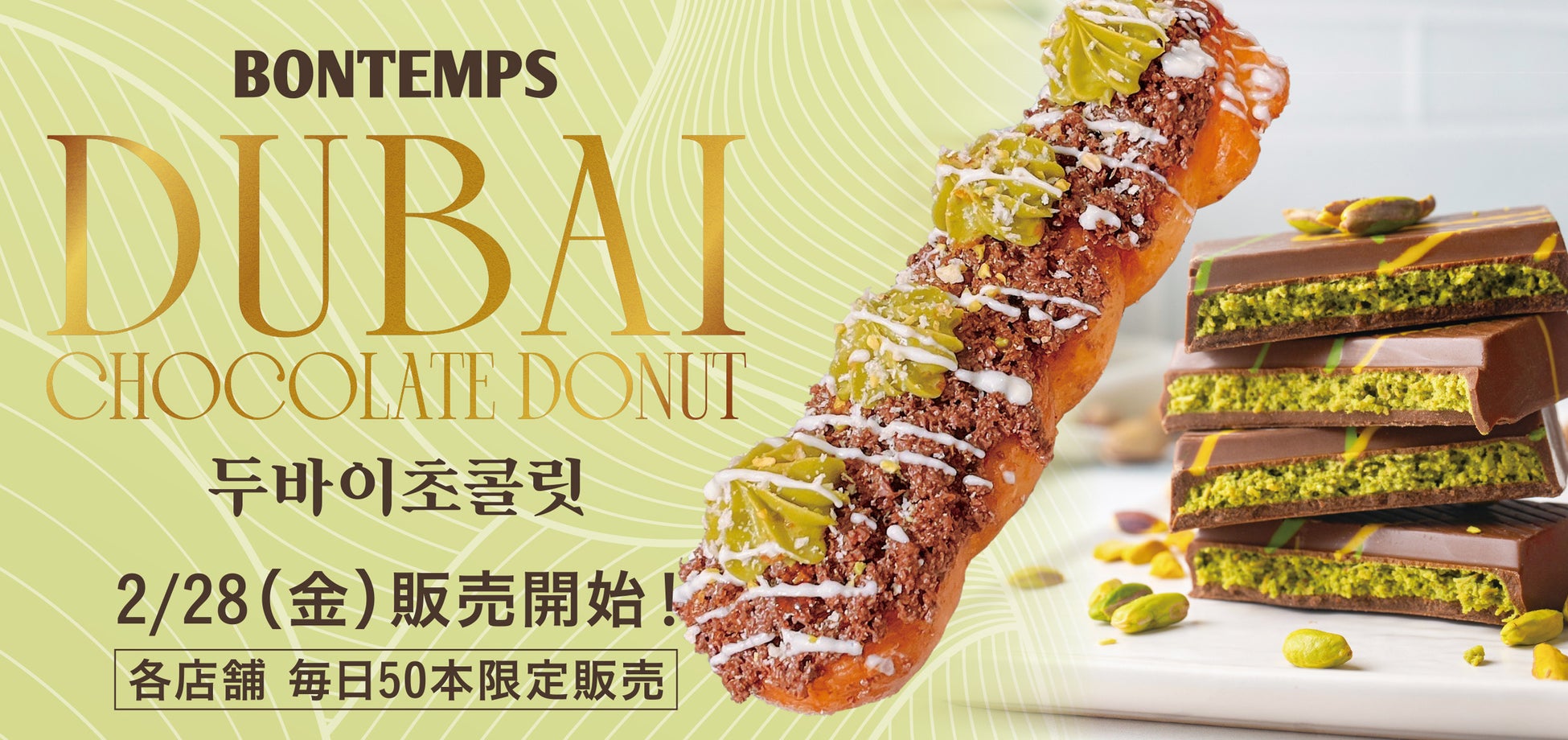 韓国で人気のカフェブランド『BONTEMPS(ボンタン)』が、2月28日(金)より、期間限定メニューとなる「ドバイチョコレートドーナツ」を販売開始いたします。韓国本店で先行して販売、爆発的ヒット商品となった今だけの味を、ぜひお楽しみください。
