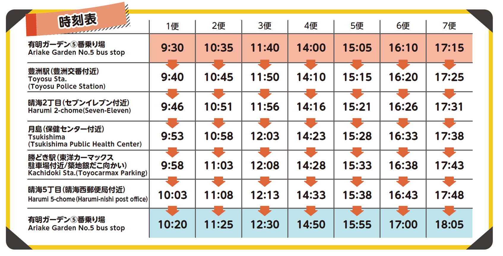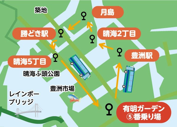 有明ガーデン1Fバスターミナル 5番乗り場 ↓ 豊洲駅(豊洲交番付近) ↓ 晴海2丁目(セブンイレブン付近) ↓ 月島(保健センター付近) ↓ 勝どき駅(東洋カーマックス駐車場付近/築地銀だこ向かい) ↓ 晴海5丁目(晴海西郵便局付近) ↓ 有明ガーデン1Fバスターミナル 5番乗り場 |