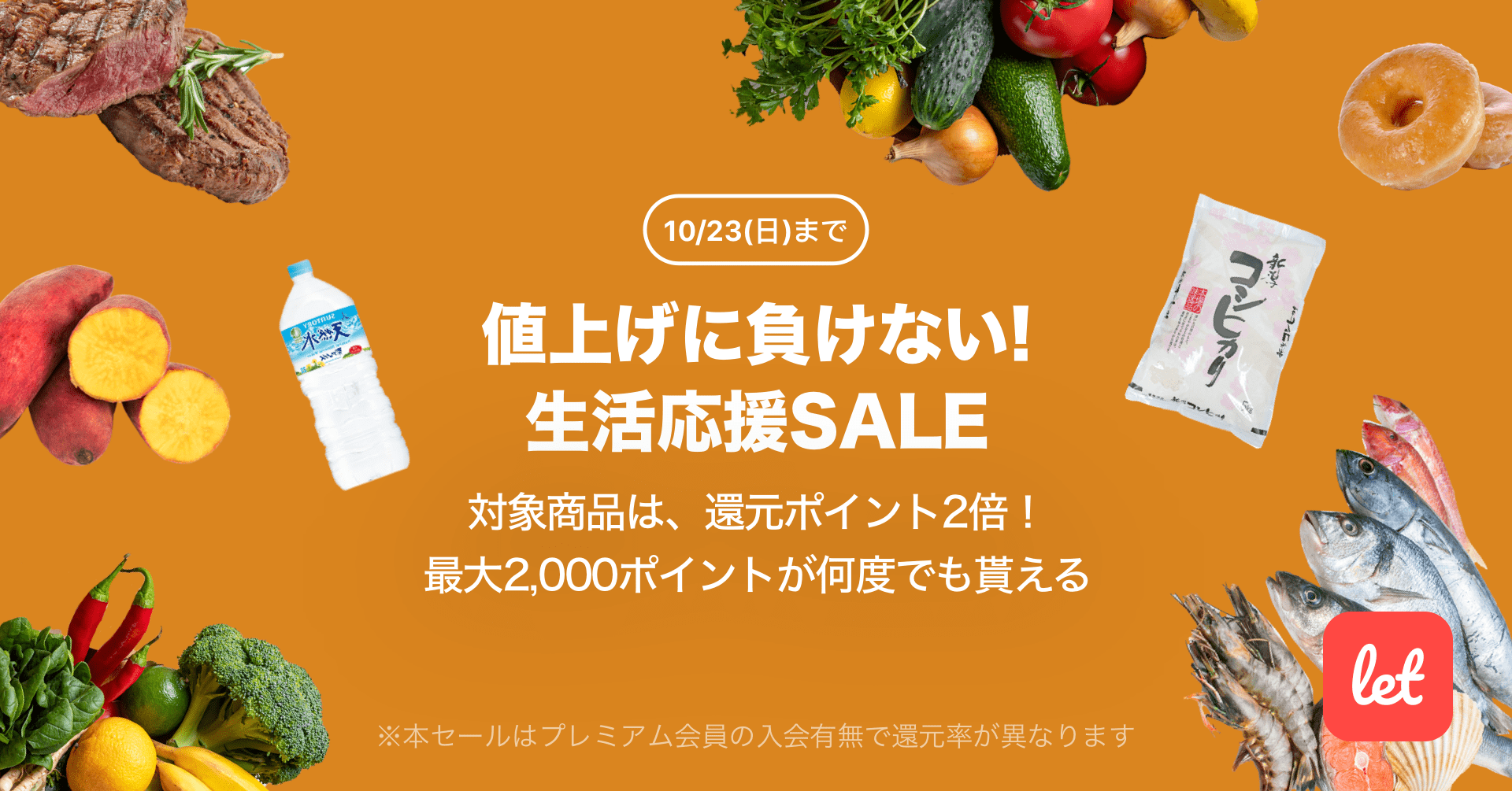 株式会社レット(本社:東京都港区、代表:佐藤 航陽)が運営する、食品ロス/在庫ロス削減のマーケット「Let(レット)」内で「値上げに負けない!生活応援SALE」を10月21日(金) 18:00より開催します。期間中、プレミアム会員様限定で対象の食品をご購入いただくと、2,000ポイントを上限に還元ポイントが2倍になります。期間中のご購入であれば、ポイント還元はお一人様あたり何度でもご利用いただけます。