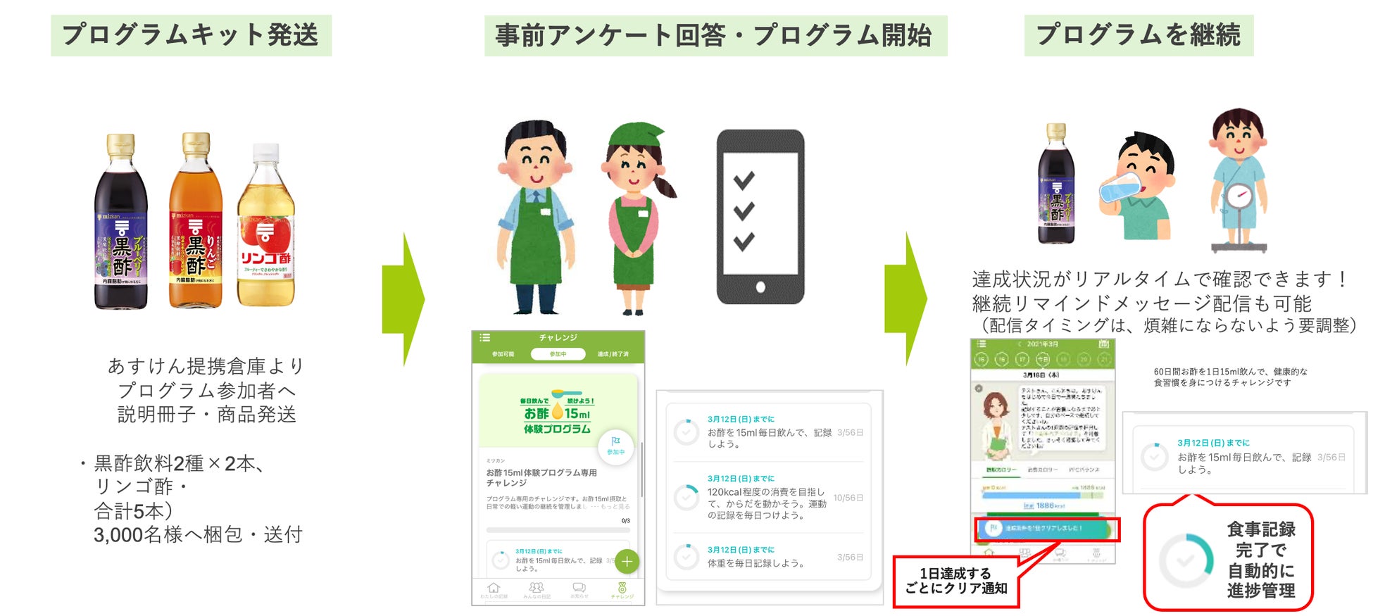 本プログラムでは新たに、食事管理・ダイエットアプリ「あすけん」と協力し、2か月間のプログラムによる従業員の健康変化を記録し、参加企業の従業員の健康増進に寄与しています。