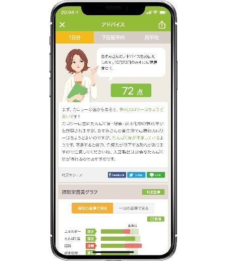 食事を記録すると、すぐに栄養計算・アドバイスが表示されます。食生活改善のプロフェッショナル管理栄養士のノウハウとAI技術を組み合わせたアドバイスがユーザーの行動変容を促します。