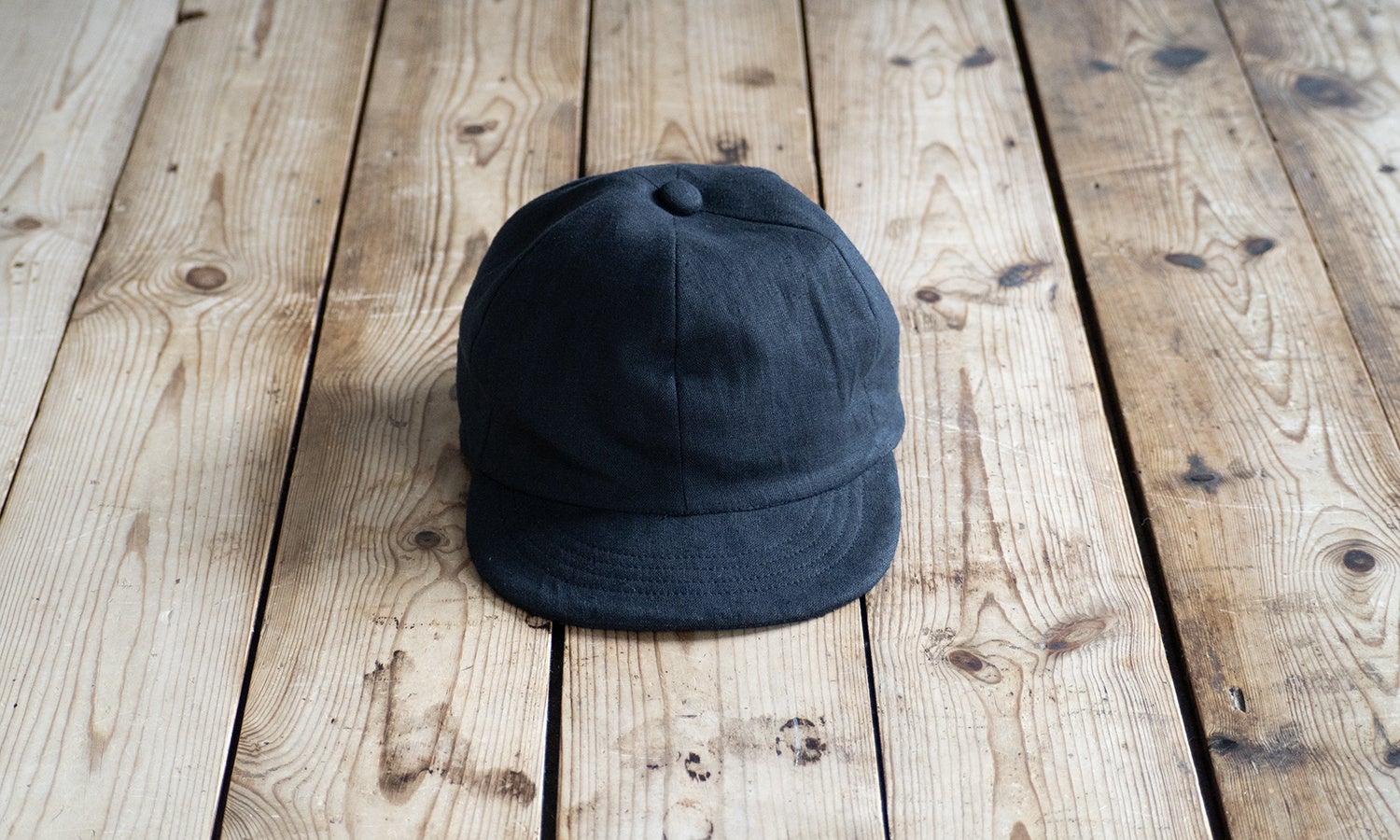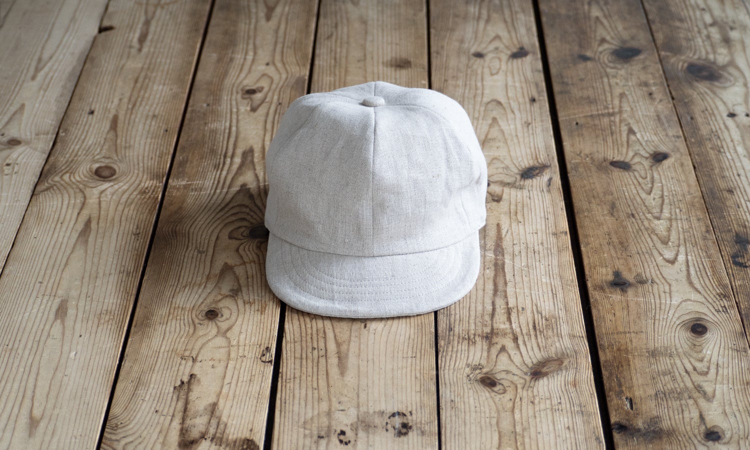 CONFECTのキャップは、主にキャスケットを作る職人に依頼しています。それにより、スポーティなフォルムをしたキャップではなく丸みを帯び、ツバの柔らかいリネン生地と相性の良いキャップに仕上がります。ツバはやや短く柔らかい。クラウンには芯を貼らず、頭に馴染みます。