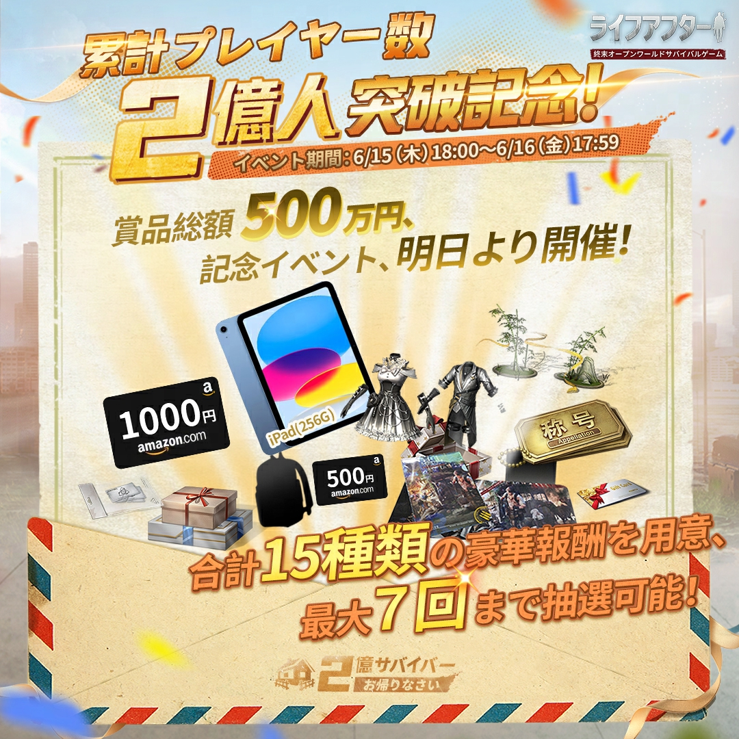 ゲーム内のイベントだけではなく、6月15日の18:00から6月16日の18:00まで、「ライフアフター」公式ツイッターにて、「2億サバイバー、お帰りなさい」記念に大型抽選イベントを開催します。イベントに参加すると、ライフアフターで使える特別な称号、iPad、Amazonギフトカード、限定グッズなどが当たるチャンスもあります。公式ツイッターをフォローして、最新のイベント情報をリアルタイムで把握しましょう。