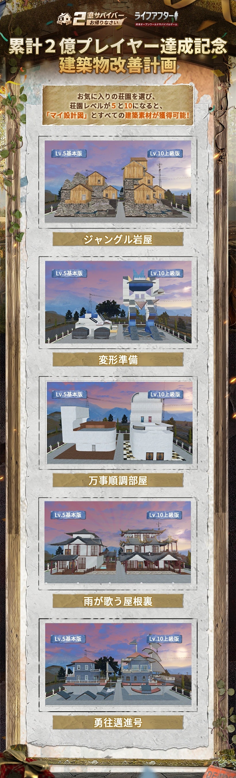 6月15日からイベントに参加するだけで、終末世界の家が無料で獲得できます。ジャングル岩屋や変形準備など、五つの家のデザインを用意しており、その中から気に入った設計図を1つ選ぶことができます。さらに設計図だけではなく、サバイバーの荘園がレベル5、レベル10に達すると、その設計図に必要な材料をなんと全部「無料」でもらえます!
