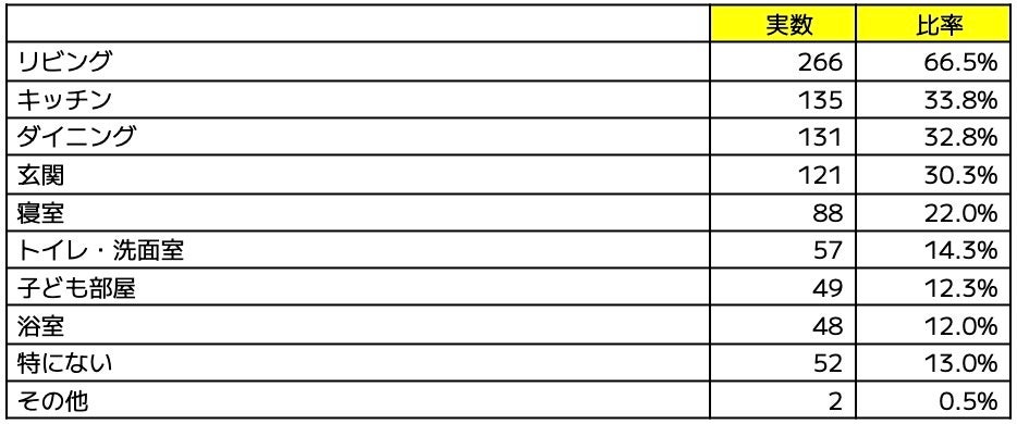 リビング(66.5%)、キッチン(33.8%)、ダイニング(32.8%)