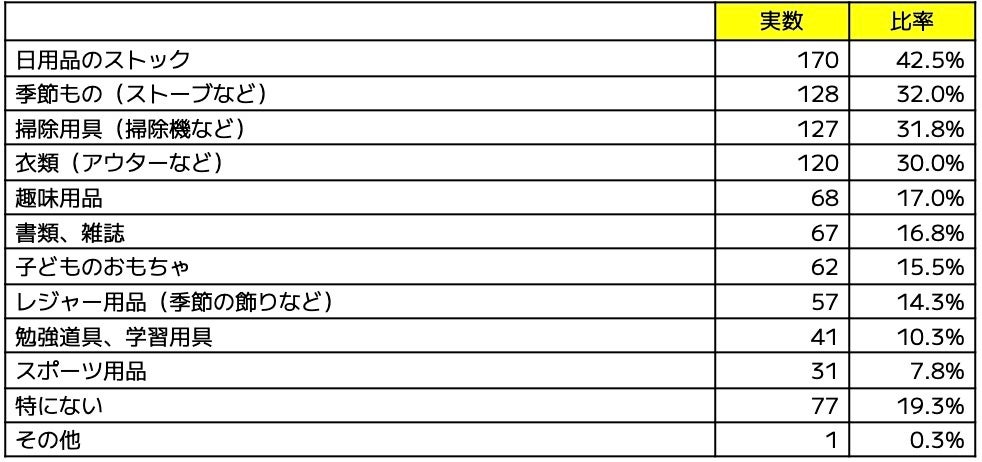 日用品のストック(42.5%)、季節もの/ストーブなど(32.0%)、