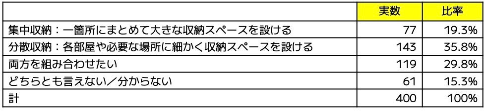 理想的な収納スタイルとしては、分散収納:各部屋や必要な場所に細かく収納スペースを設けるが最も多く35.8%となり、集中収納:一箇所にまとめて大きな収納スペースを設けるの19.3%に比べて支持が高く、両方を組み合わせたいとの回答も29.8%となっています。