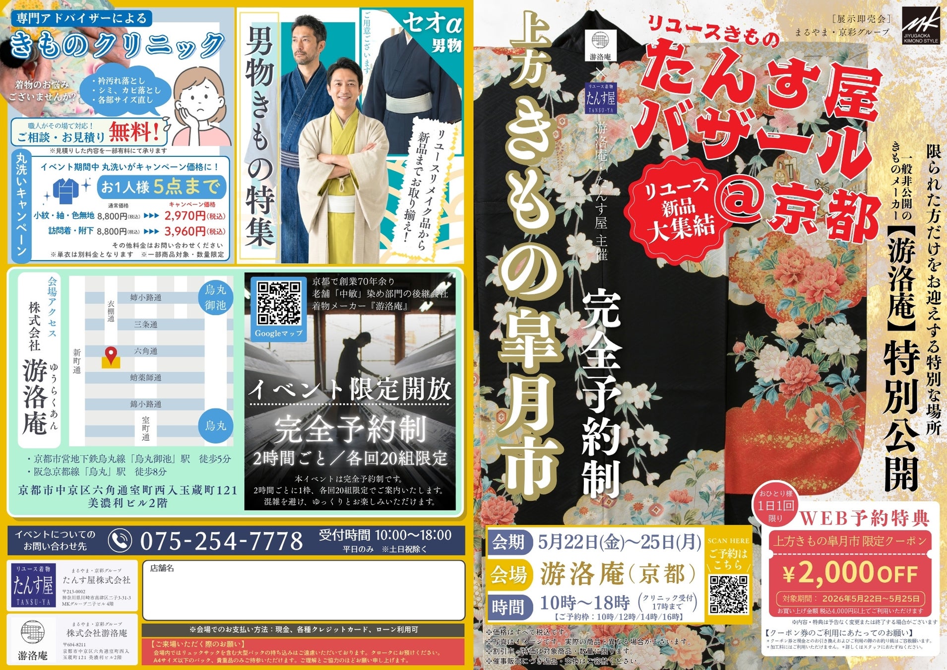 リユース着物「たんす屋」と「游洛庵(ゆうらくあん)」(京都市中京区)は、2026年5月22日(金)から25日(月)までの4日間、完全予約制のきものイベント「上方きもの皐月市」を開催いたします。