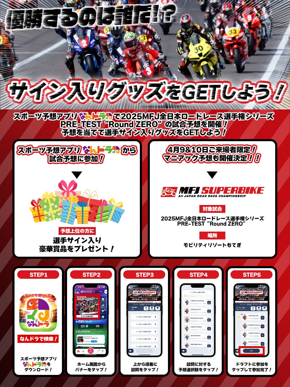 イノベーションの力で新たなスポーツ・エンターテインメントを創造し、まだ見ぬ感動と熱狂を提供するアプリ「なんドラ」を運営する株式会社なんでもドラフト(本社:東京都渋谷区、代表:森井啓允)は、4月9日(水)・10日(木)モビリティリゾートもてぎにてに行われる、全日本ロードレース選手権シリーズのプレテスト『PRE-TEST "Round ZERO"』のJSB1000クラスにて予想企画を開催します。