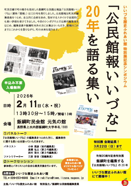 町制20周年特別展「飯綱町を編集する『公民館報いいづな』の20年」の開催を記念して、シンポジウムを開催します。歴代編集長がそれぞれの思い出を語るパネルトークや、パネリストと参加者を交えたトークセッションを予定しています。「公民館報いいづな」からみえる飯綱町のこれまでとこれからを語ります。ぜひご参加ください。