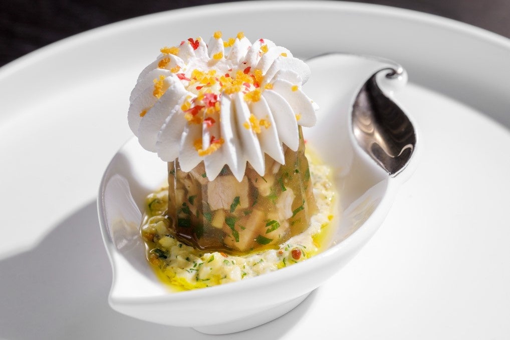 ブルゴーニュ地方で春に行われるイースター祭のお料理として発祥し、現在はブルゴーニュ地方の郷土料理でもあるハムとパセリのゼリー寄せ「ジャンボン・ペルシエ」をご用意いたしました。