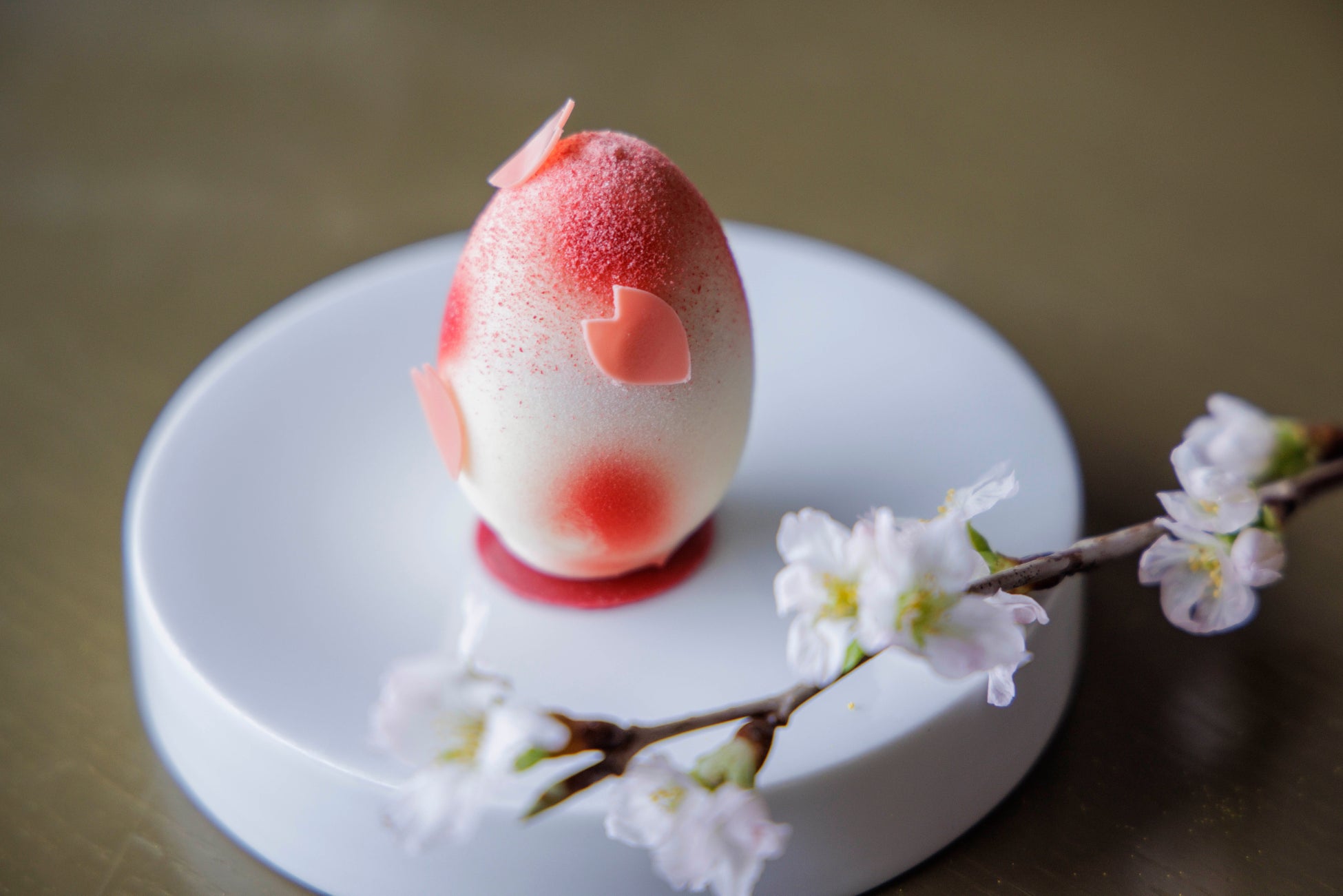 ヨーロッパの春のビックイベント「イースター」を祝うエッグを、ミケーレが日本風にデザインした可愛らしいスイーツをご覧ください。穏やかな春風に舞う桜模様をあしらい、テイストは北フランスでお馴染みの「メルヴェイユ」を参考に作られ、苺とルバーブ、ローズのジュレとメレンゲをヨーグルトのムースで包みホワイトチョコレートでコーティング。軽やかで華やかな味わいの眼福、口福な春のデザートをお楽しみください。