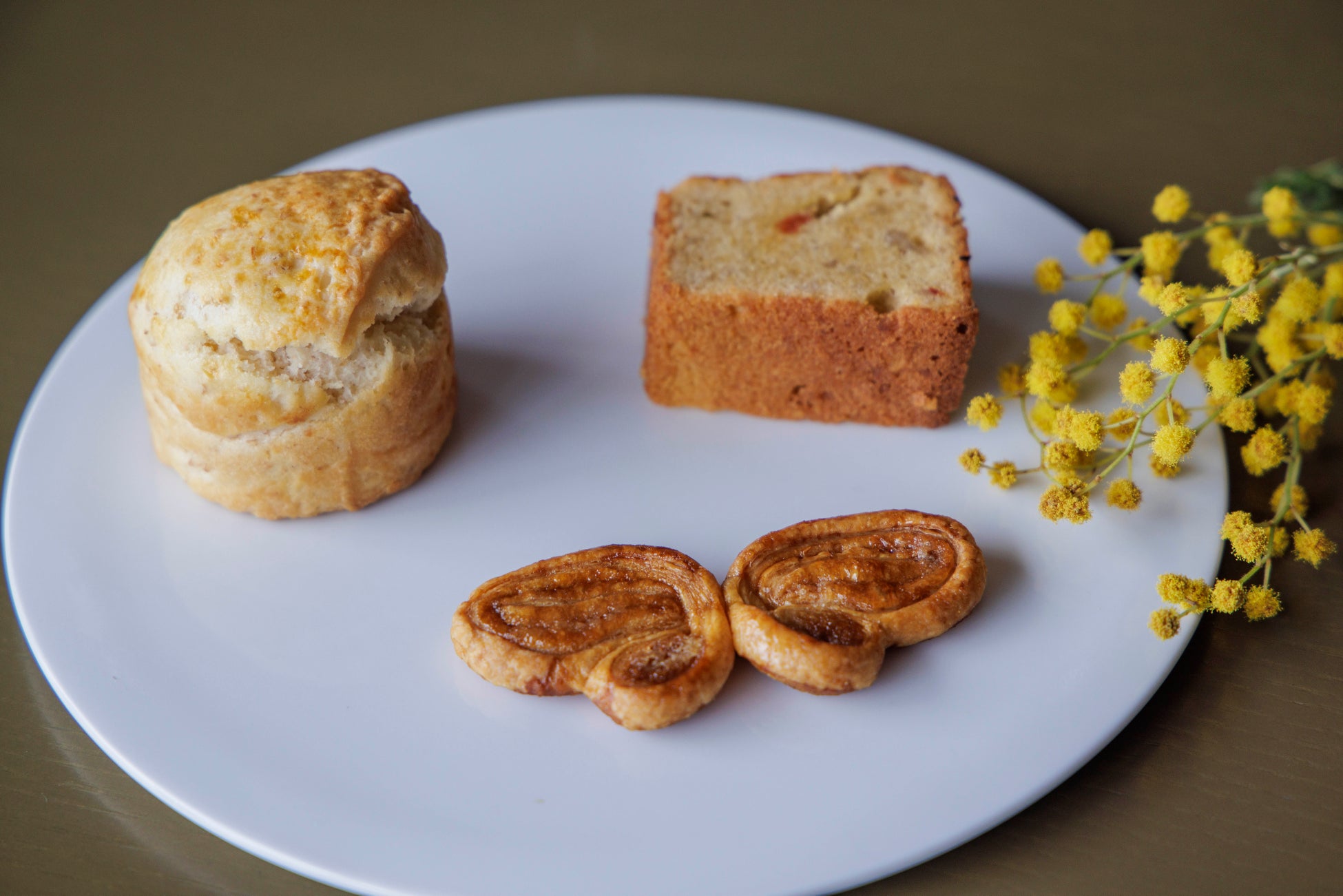 3段目にはお花の周りを飛び回る蝶々型のパルミエや、ヨーロッパのアフタヌーンティーでは欠かせないスコーンもご用意しております。