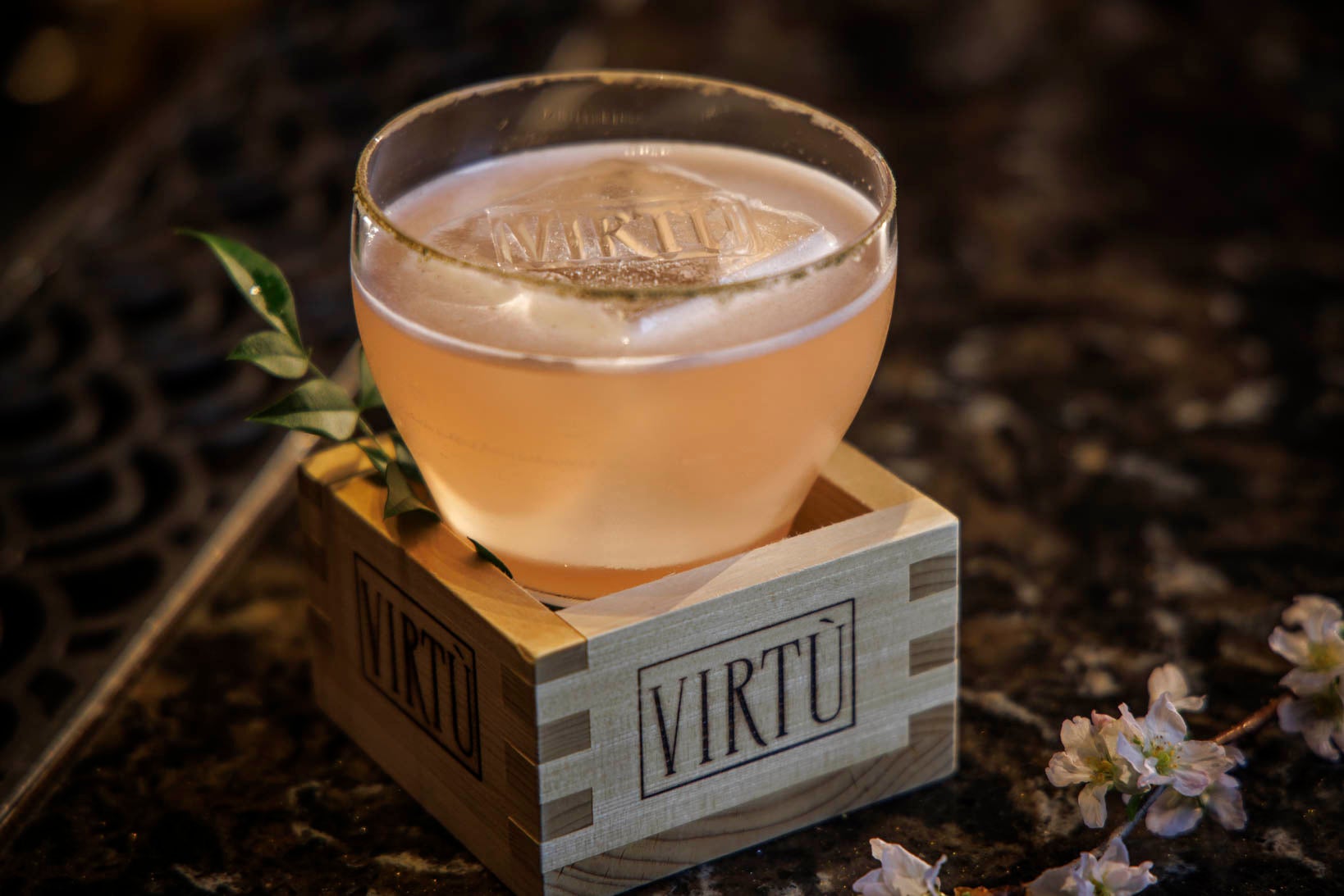 檜桝に入れたグラスの縁には抹茶塩でデコレーションを施し、雅な日本の春を感じるカクテルを是非この機会にお試しください。