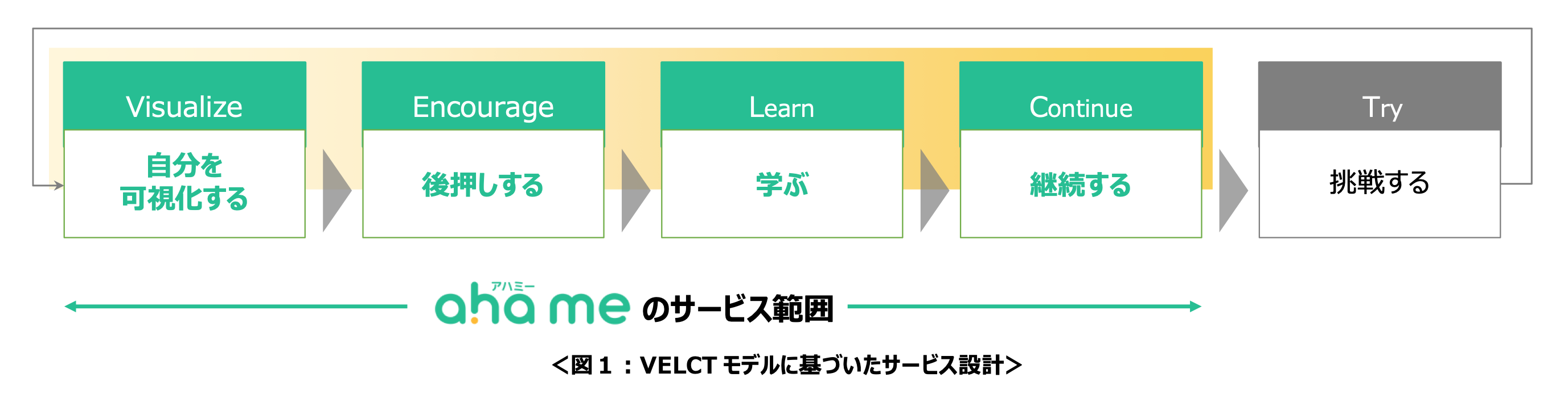 『ahame』のサービス設計では、VELCTモデルに基づき、学びの第一歩である「自分を可視化する」から「継続する」に至るまでの一貫したプロセスを重視しています。『ahame』の名前の由来は「アハ体験(aha)+自分(me)」です。本サービスが自分にとって“はたらく”をチョットだけ楽しくするアイデアや気づきを得るきっかけになってほしいという想いが込められています。