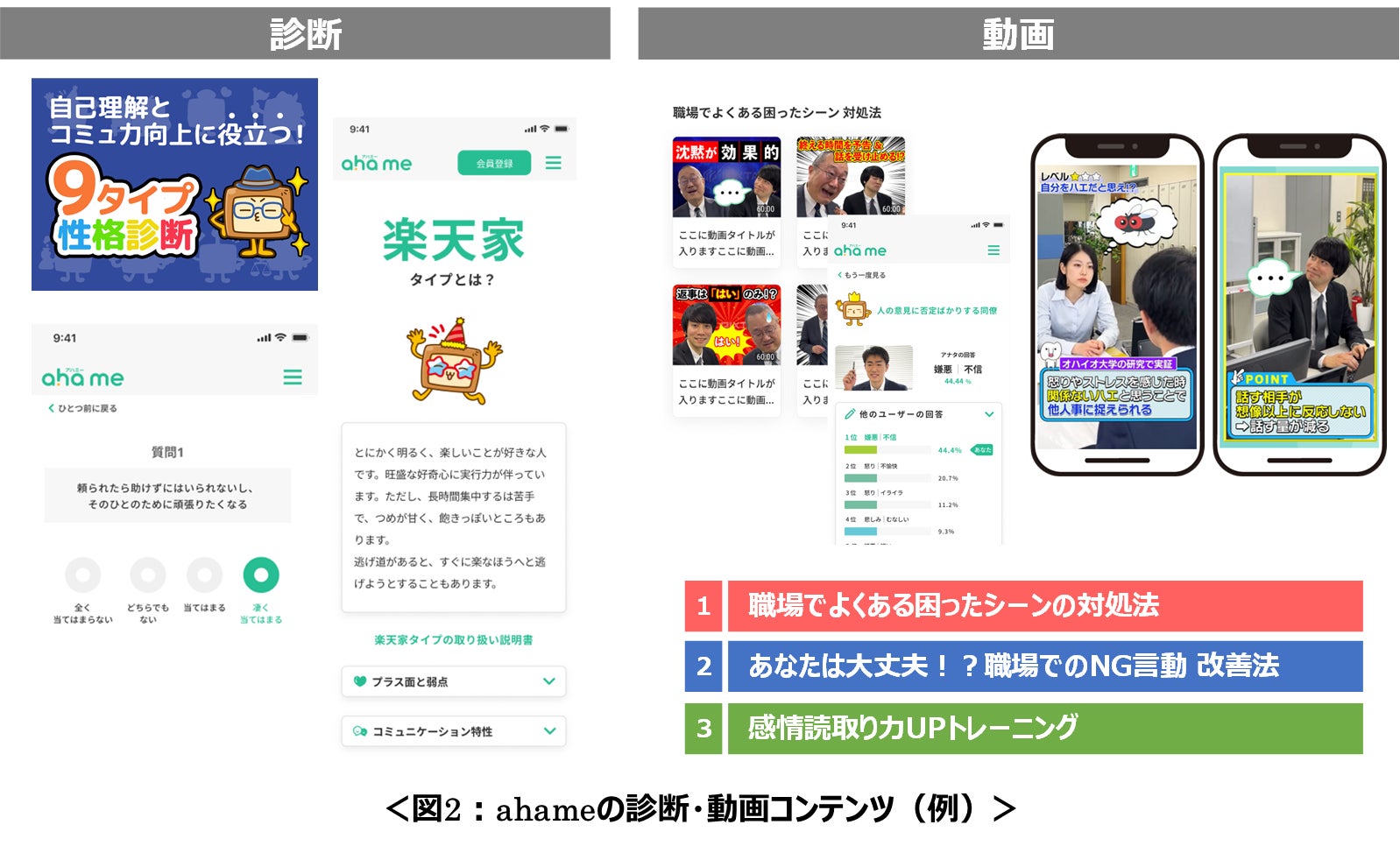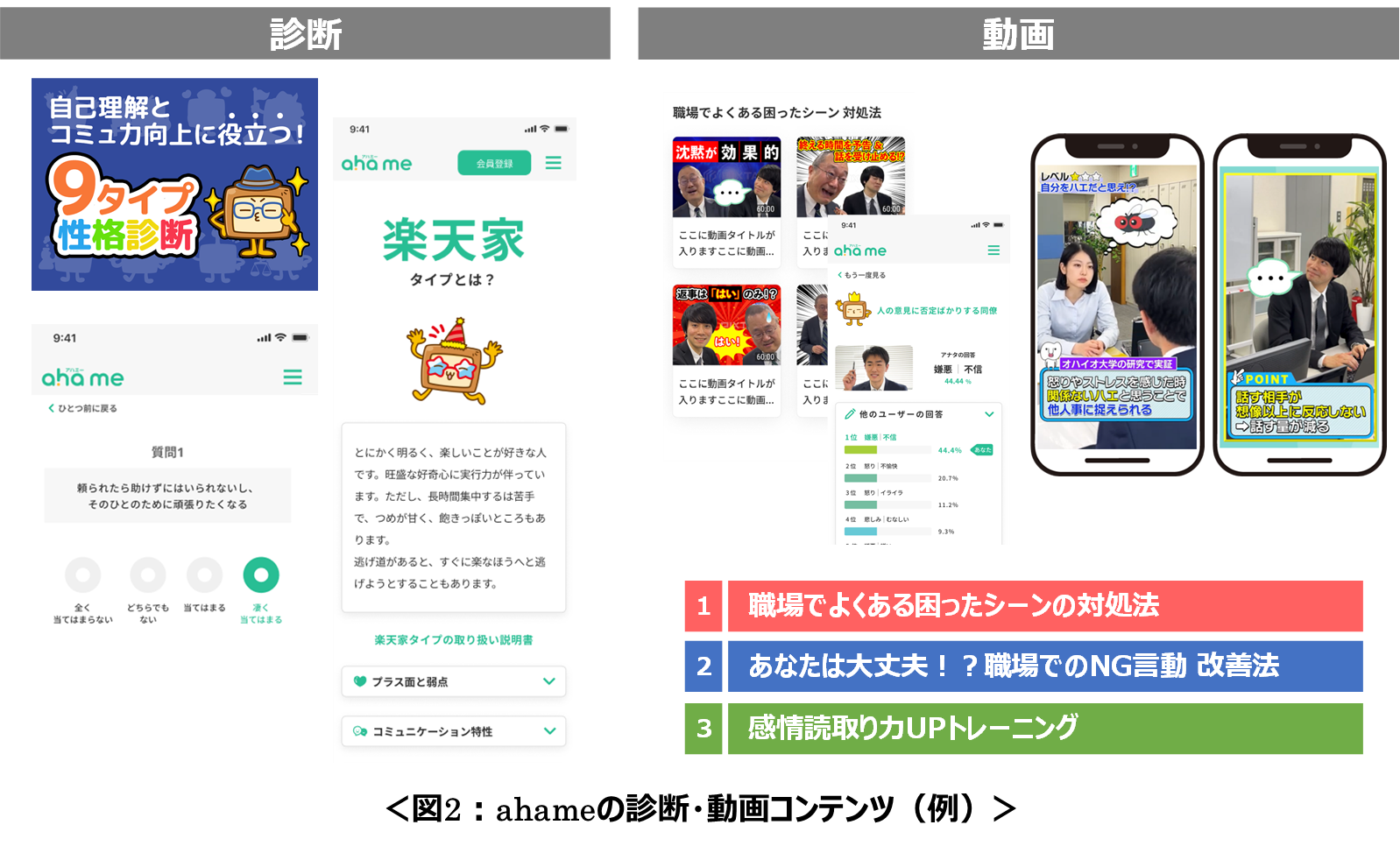 『ahame』は、坪田信貴氏監修の自己理解とコミュニケーション力の向上に役立つ「9タイプ性格診断」と職場のよくある人間関係の困りごとを解決するための「動画コンテンツ」をメインとしたサービスです。ユーザーの診断結果に基づき、その性格タイプに最適な動画コンテンツをリコメンドすることで、短い時間で効率よくコミュニケーションスキルとEQを向上させ、職場の人間関係をより良くするためのポイントを学ぶことができます。また、本サービスは、1日わずか「3分程度」で取り組めるよう設計されており、忙しいビジネスパーソンでも無理なく続けられる工夫がされています。