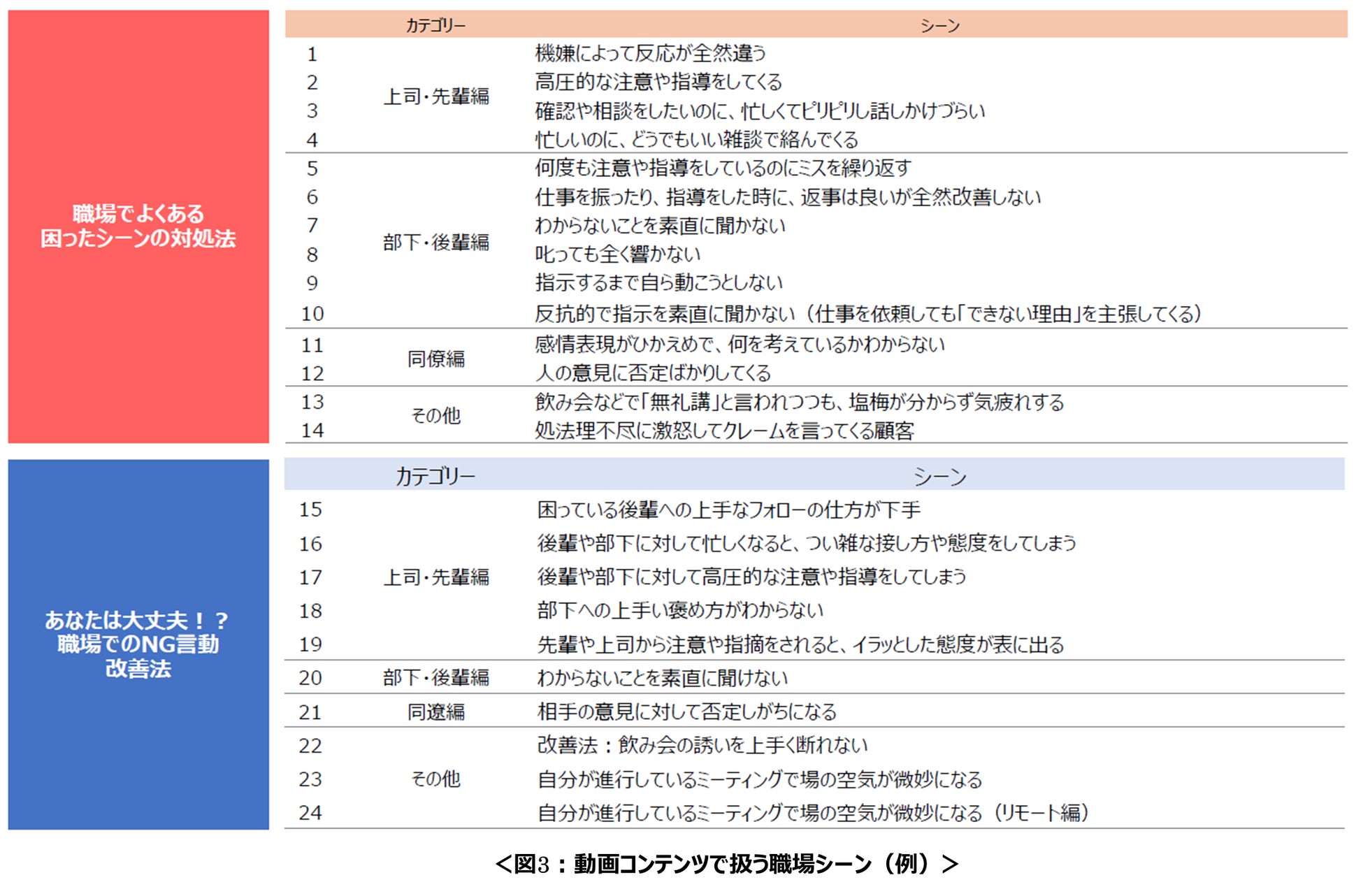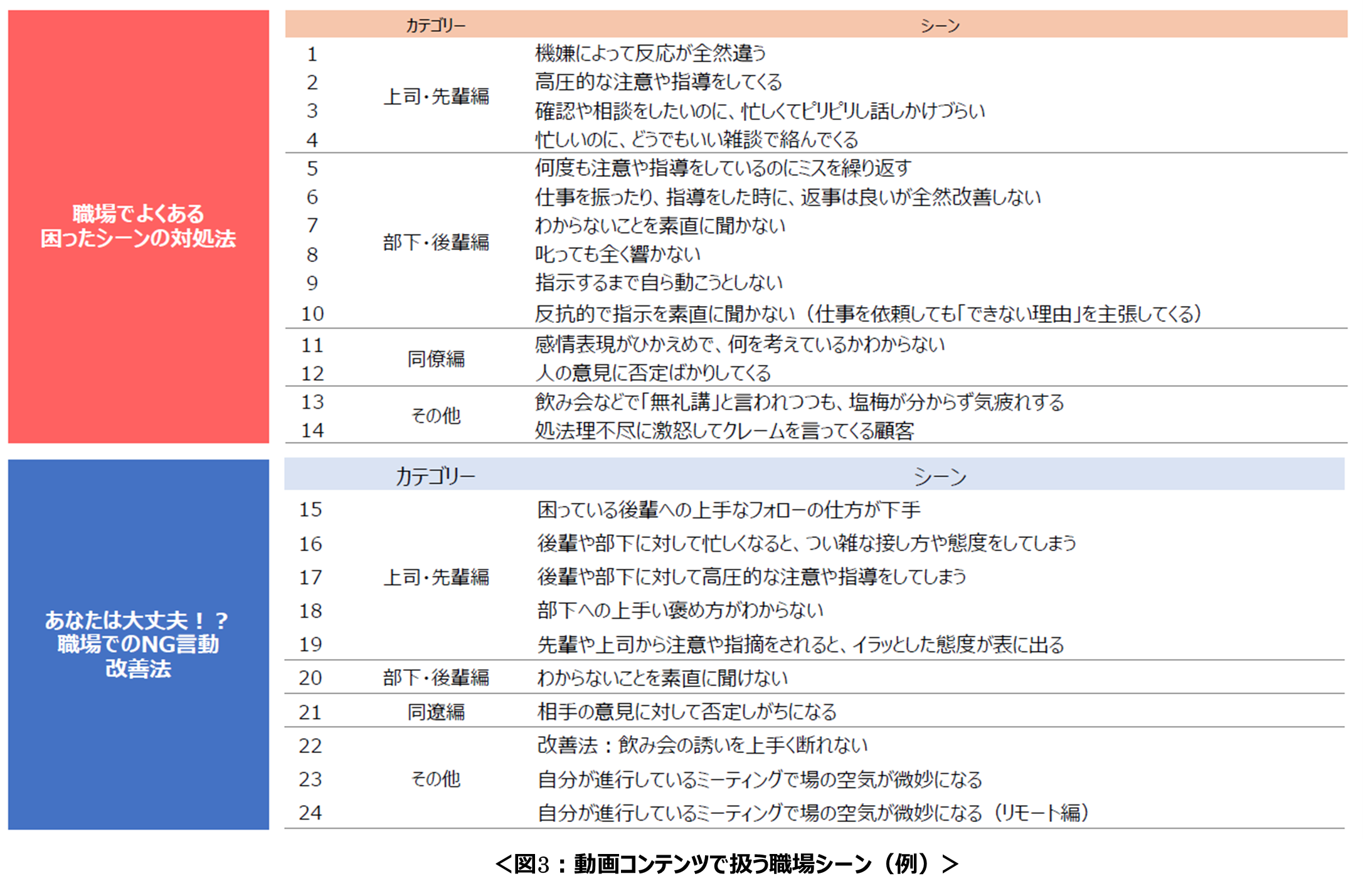 動画コンテンツで紹介している職場のよくあるシーンは、20代から50代までのビジネスパーソン1,800人に対して行ったアンケートを元に選定しました。リリース時には以下の3種類、約100コンテンツの提供を予定しています。リリース後も新たなコンテンツの追加やサービス・機能拡張などを計画しています。