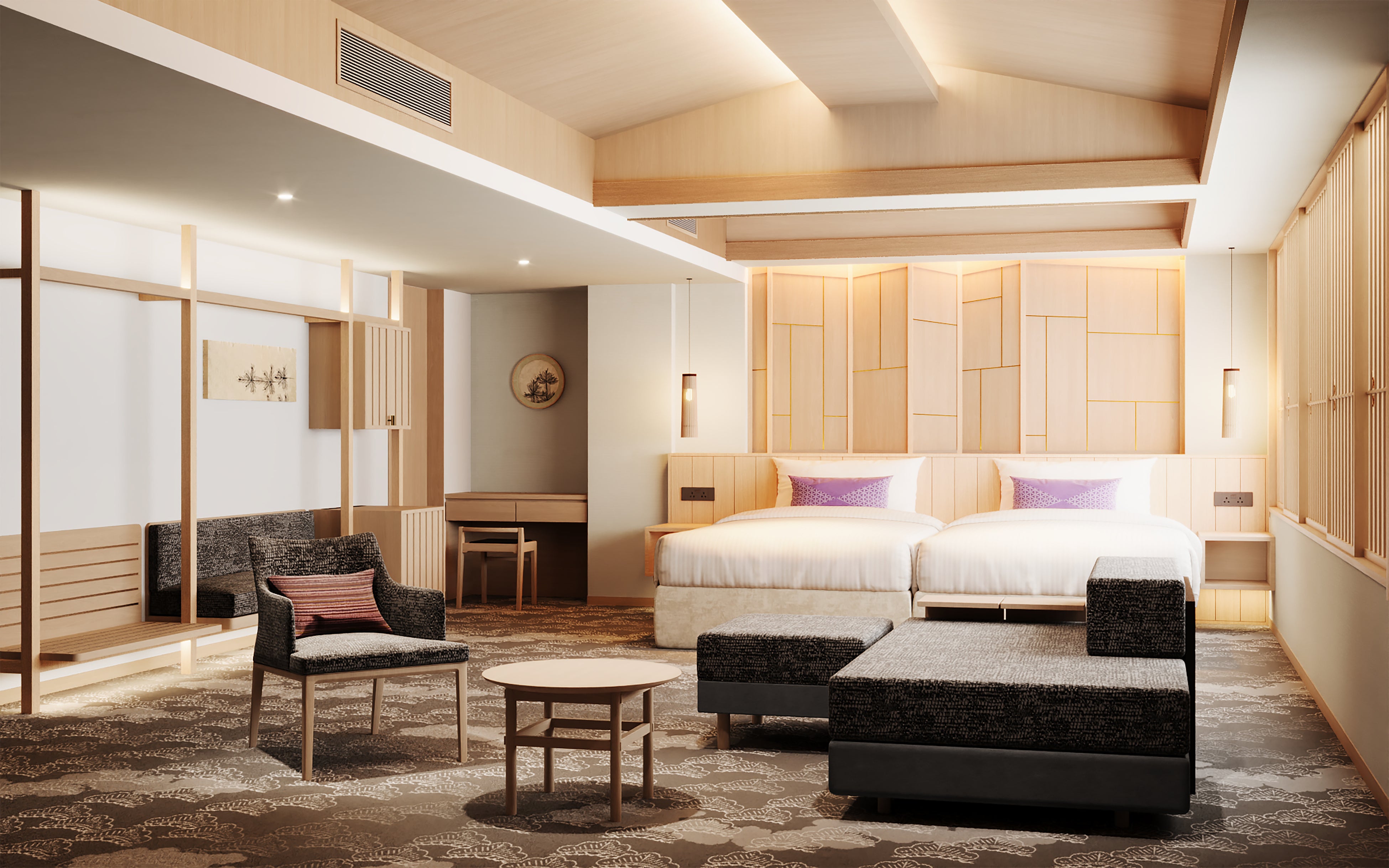 お客様のニーズの多様化に対応するため、客室はジュニアスイートツイン1室およびデラックスツイン5室をリニューアル。内装・家具・備品を一新し、3名様利用から、従来は設けていなかった最大4名様まで宿泊可能な客室として改修することで、ファミリーやグループでのご利用に最適な空間へと生まれ変わります。
