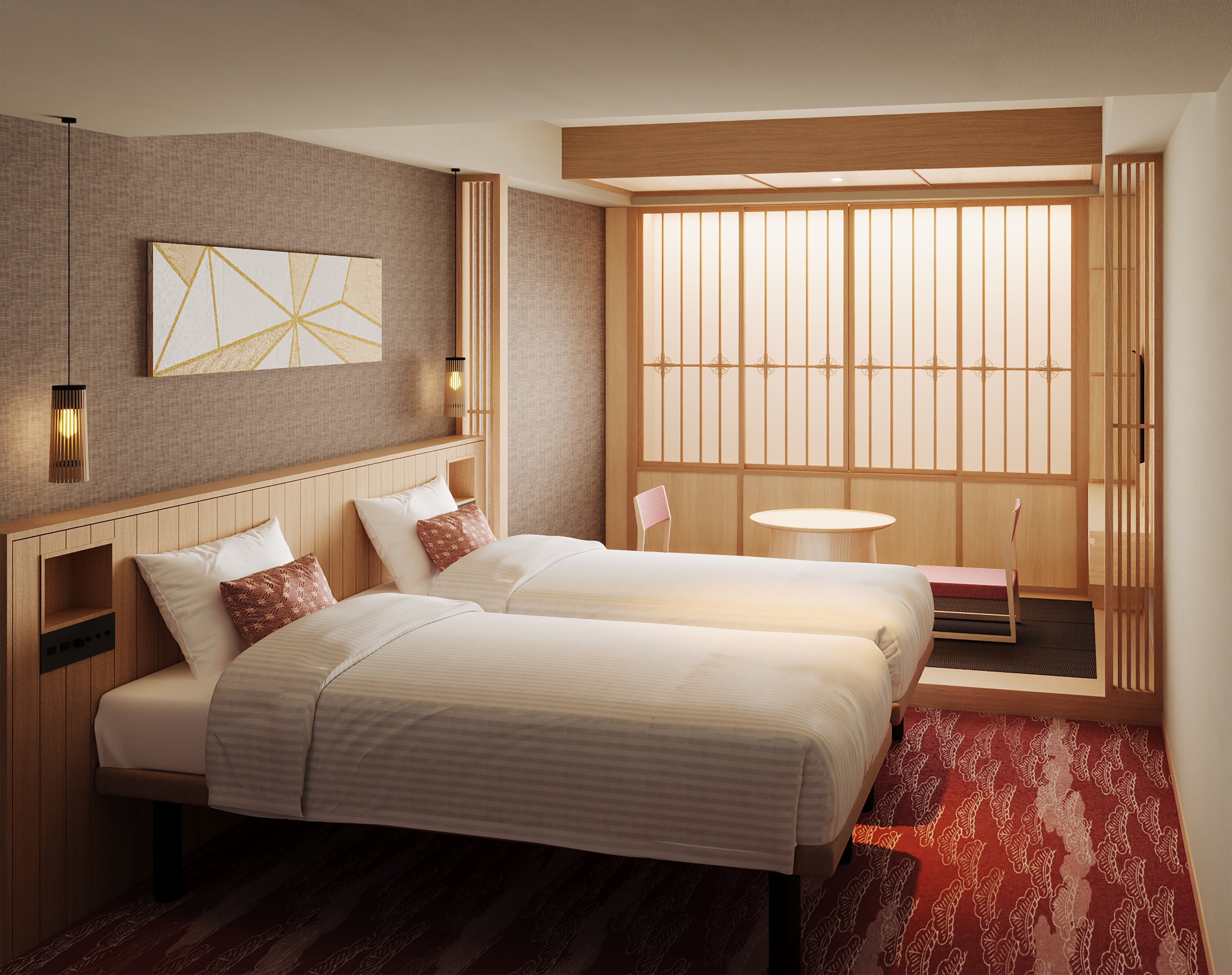 ホテル内で最も広い57㎡のジュニアスイートツインは、ゆとりある広さを活かし、リビングを備えた贅沢な設えが特徴の客室です。格子や自然素材を使用した開放感あふれるの和空間に、友禅染を用いたアートや京都の自然をモチーフにしたファブリックをあしらい、地域の魅力と調和したワンランク上の京都滞在をお届けします。水回りも一新し、機能性と清潔感を向上させることで、より快適にお過ごしいただける環境を整えました。また、デラックスツインは内装・家具を一新し小上がりを備えた和モダンな空間へとリニューアル。新設した畳スペースでゆったりとくつろぎながら、京都ならではの上質感なひとときをお愉しみいただけます。