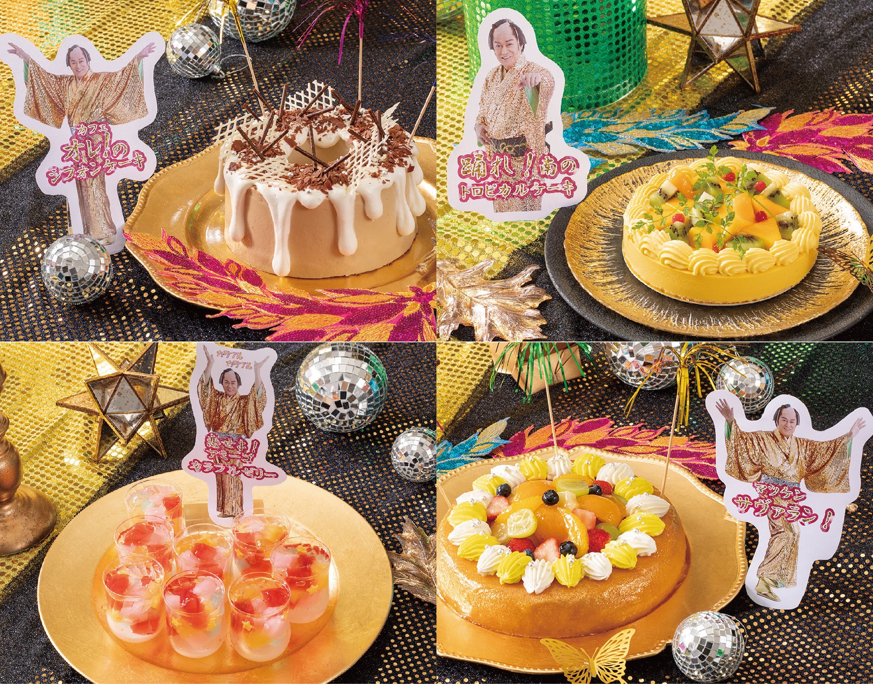 カフェオレ!のシフォンケーキ/マツケン サヴァラン/踊れ!南のトロピカルケーキ/恋せよ!アミーゴ カラフルゼリー/いちごのショートケーキ/チョコレートムース/抹茶のカップケーキ