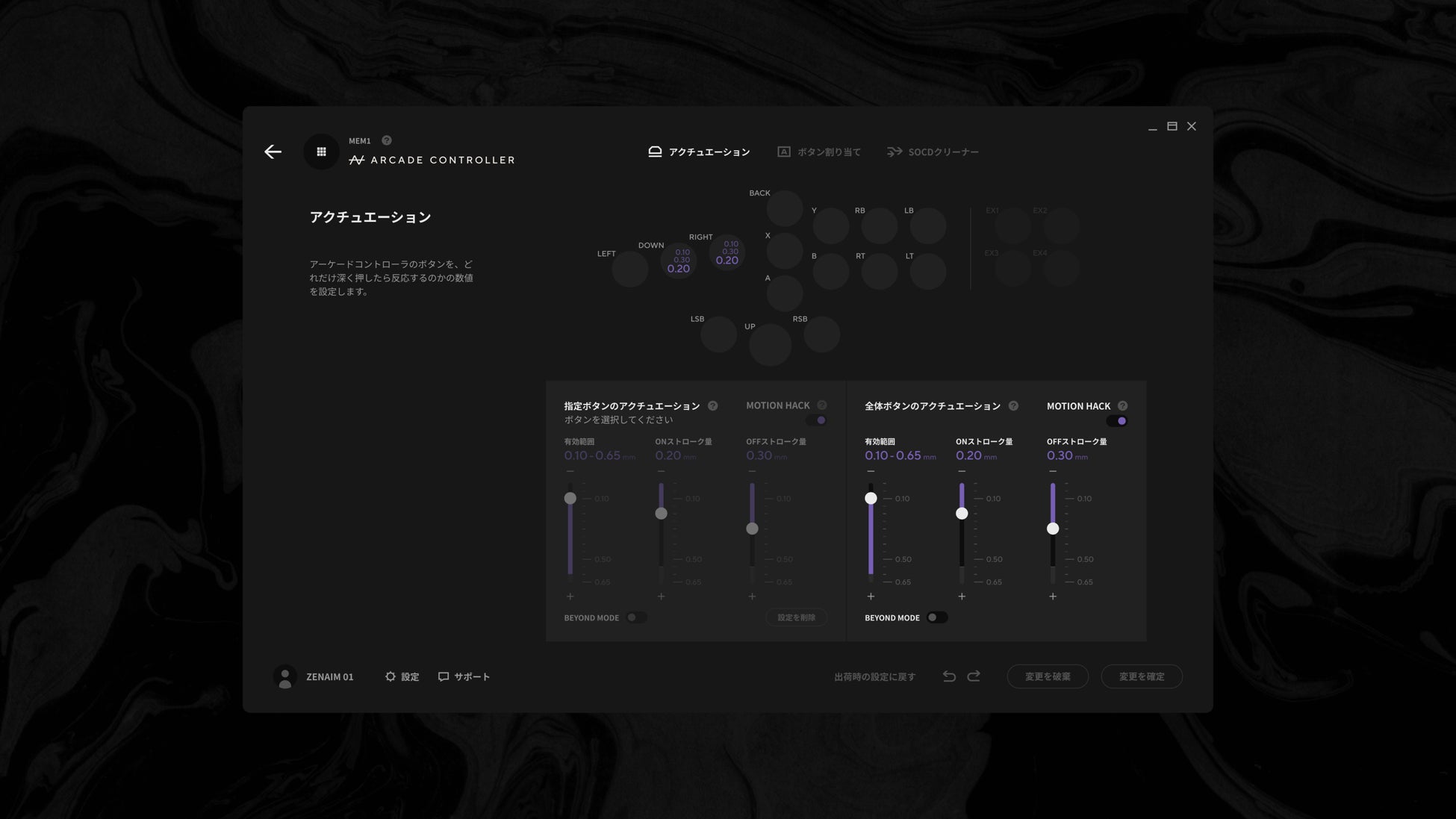 ボタンごとのリマップやMOTION HACK(ラピッドトリガー)を含むAP/RP設定を0.05mm単位で細かく設定することが可能。