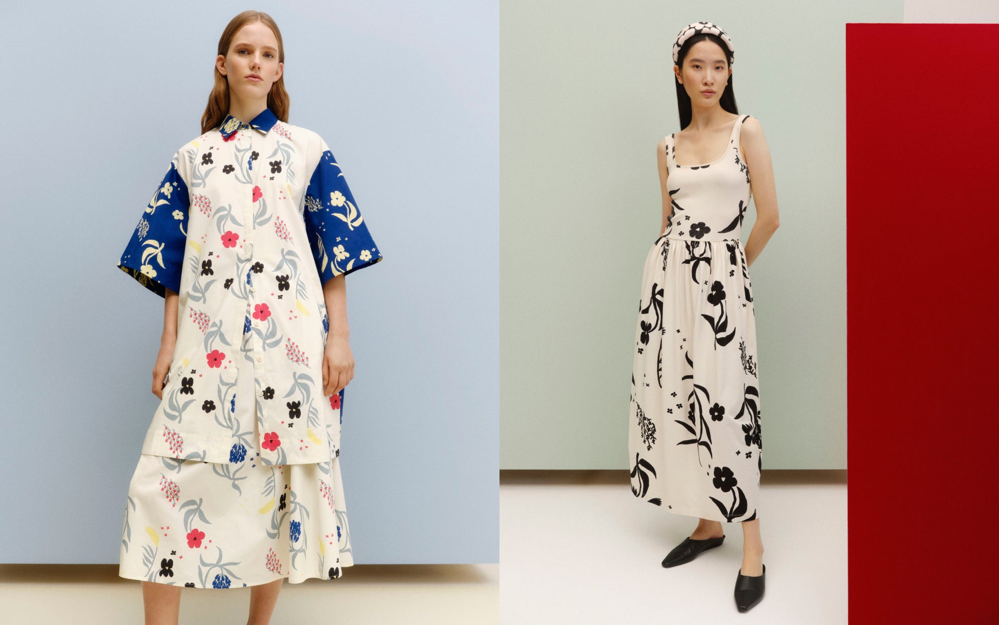 2023年プレフォールコレクションでは、マリメッコのアイコニックなプリントを中心に採用。1956年のマイヤ・イソラ(Maija Isola)によるキヴェット(Kivet/石)、1964年のセイレーニ(Seireeni/セイレーン)のようなスケールの大きいパターンをはじめ、1977年のペンッティ・リンタ(Pentti Rinta)によるキヴィナケーウンタ(Kivi näkee unta/夢見る石)や1960年代のアンニカ・リマラ(Annika Rimala)のオステリ(Osteri/牡蠣)のような抽象的なプリントも登場。シーズンのテーマであるコロラマは、2000年代の次世代プリントデザイナーであるロッタ・マイヤ(Lotta Maija)のモダンなフローラルプリント、ヘルバーリオ(Herbaario/ハーバリウム)とスヴェカス(Suvekas/夏のような)、スヴィキンップ(Suvikimppu/夏のブーケ)とトゥーラフドゥス(Tuulahdus/そよ風)など、キュレーションされたプリントを通してフラワーラマ(flowerama)も表現しています。