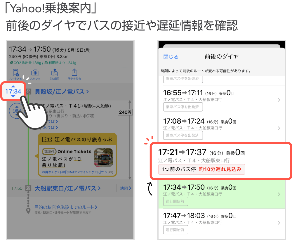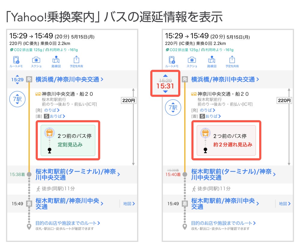 ユーザーが検索したルート上に神奈中バスまたは江ノ電バスがある場合、ルート検索結果画面に出発後のルートや遅延情報を表示します。バスの位置情報から遅延しているバスが今どこを走行しているのかを確認でき、平常時と比較して約何分遅れているかが表示され、バスの発車予定時刻も修正されます。