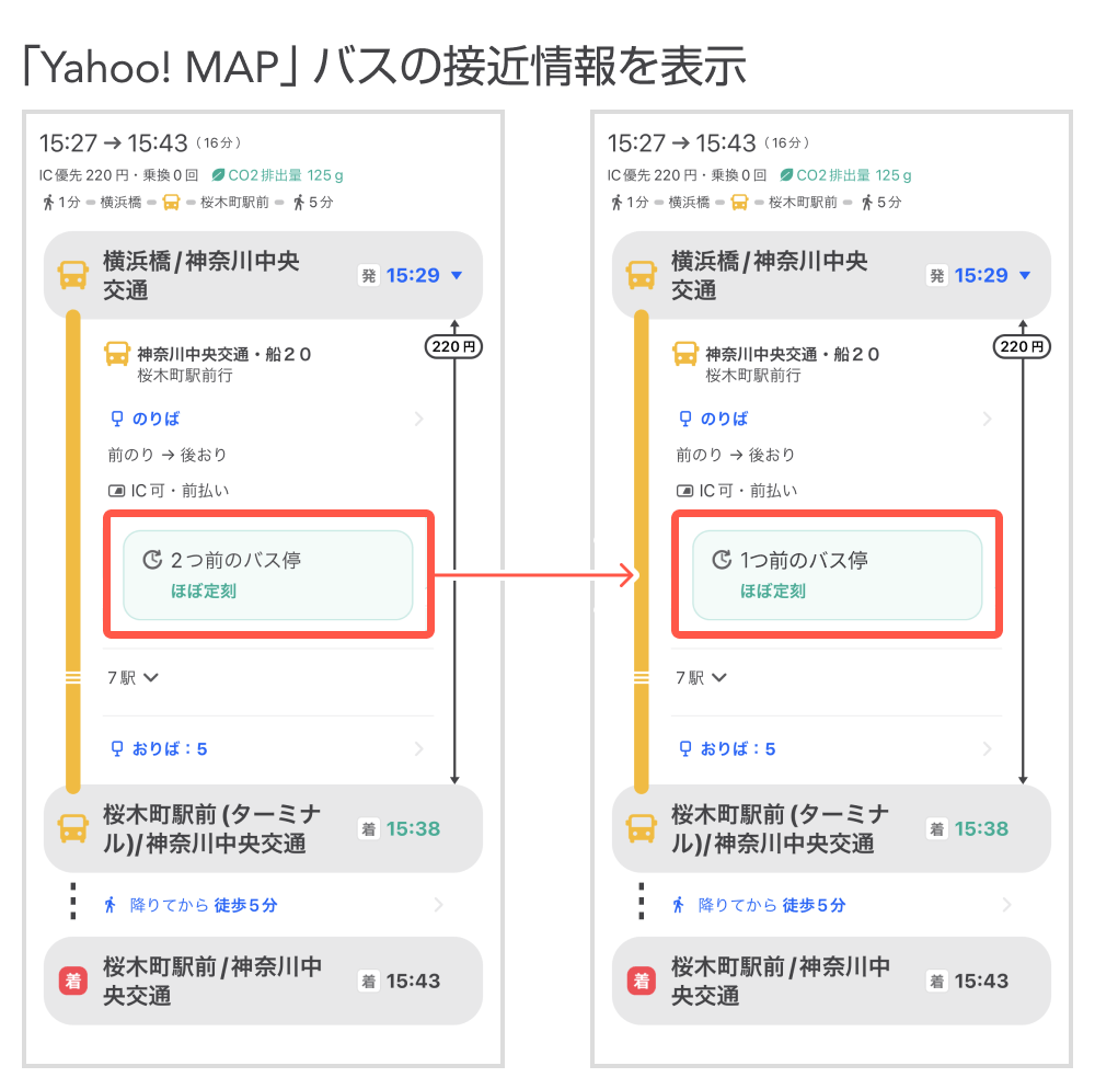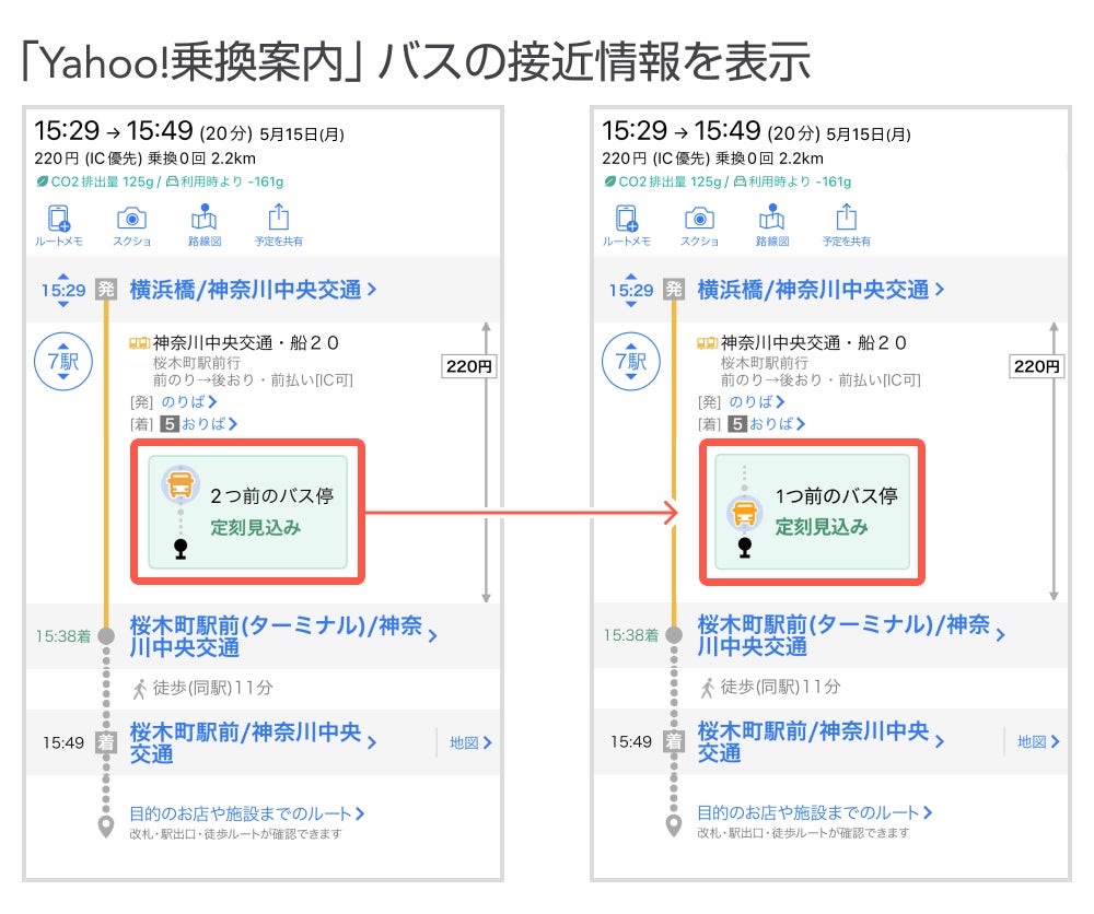 ユーザーが検索したルート上に神奈中バスまたは江ノ電バスがある場合、ルート検索結果画面の詳細を開くと「2つ前のバス停」や「1つ前のバス停」と接近情報を表示します。