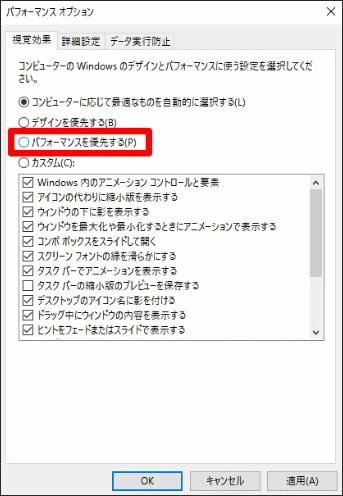 Step3:「パフォーマンスオプション」の画面が開きますので、「視覚効果」のタブで「パフォーマンスを優先する」にチェックをつけて、「適用」ボタンをクリックします。