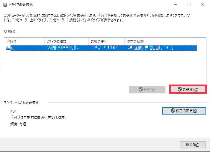 Step2:「ドライブの最適化」画面を開いたら、最適化したいドライブを選択して、「最適化」をクリックします。