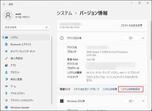 Step1:パソコンの設定を開いて、「システム」>「バージョン情報」>「システムの詳細設定」の順に進みます。