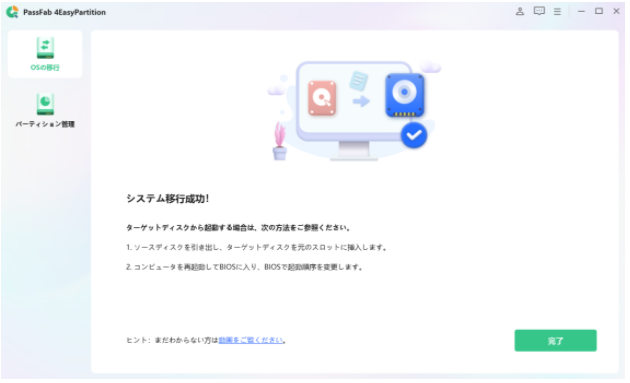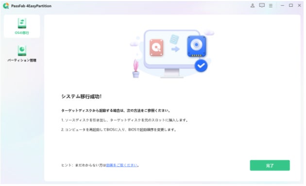 Step3:選択した内容をプレビュー画面で確認して、「開始」をクリックし、「システム移行成功!」の画面が表示されたら、「完了」ボタンをクリックします。