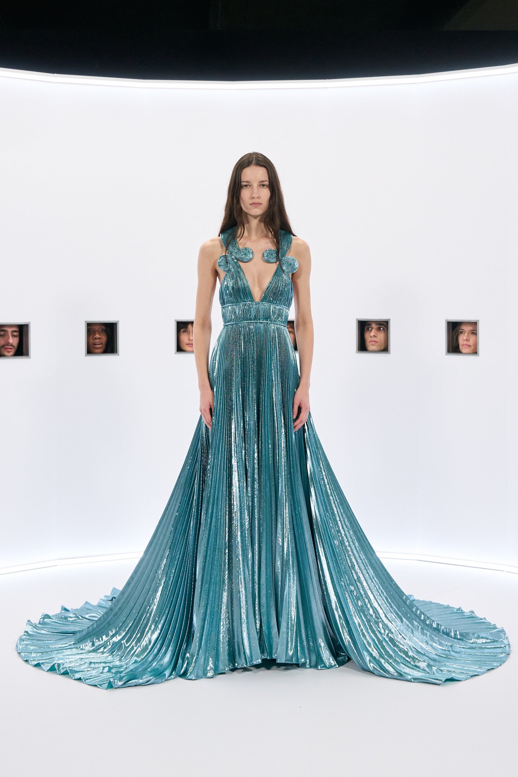 カイザーパノラマは、この伝達を可能にする装置へと変貌を遂げます。それは、衣服をイメージの強制的な循環から切り離し、儀式的な時間の中に位置づける出現の典礼です。このように隔てられた空間において、衣服はもはや急速な消費の対象ではなく、ヒエロファニー(神の顕現)として立ち現れます。それは、立ち止まり、耳を傾け、特別な心構えを必要とする神聖な存在です。ゆえにカイザーパノラマは、単なる歴史的引用でも、舞台美術の技巧でもありません。ファッションと視覚、欲望と距離、日常とそれを超越するものとの関係を問いかける理論的なジェスチャーを体現しています。ここでは、視線はもはや場面を支配するのではなく、視線そのものが問い直されているのです。