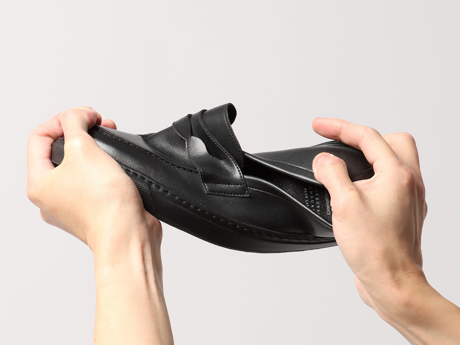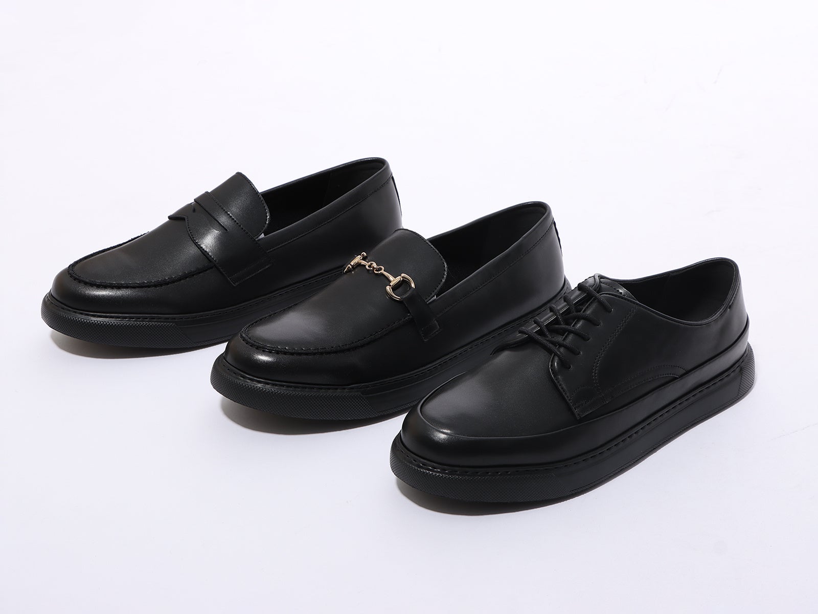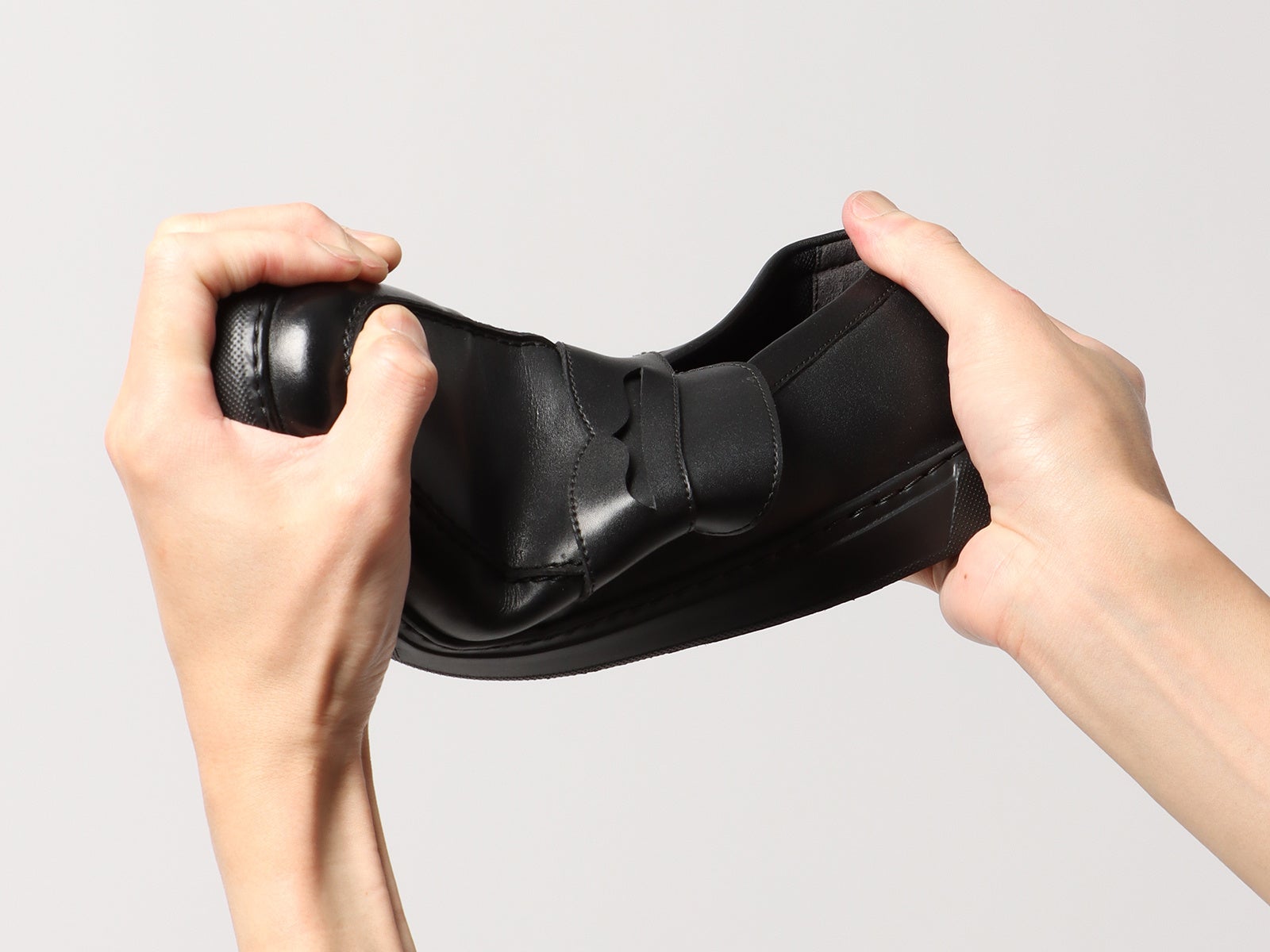 今回のシューズは、インソール・アウトソール共にランニングシューズと同様の仕様であるため、屈曲性があり非常に軽いといった特徴があります。特にインソールは、足への負担を軽減しやすいスポンジを採用していることから、長時間の歩行でも疲れにくくなっています。さらに足を覆う表面部分には、本革のような風合いを持った床(とこ)革(がわ)を使うことで、劣化しにくく柔らかさを持たせました。本企画のデザインは、プレーントゥ・コインローファー・ビットローファーの3種類を用意しており、さまざまなビジネスシーンで使いやすく、汎用性にもコスパにも優れたビジネスシューズとなっています。