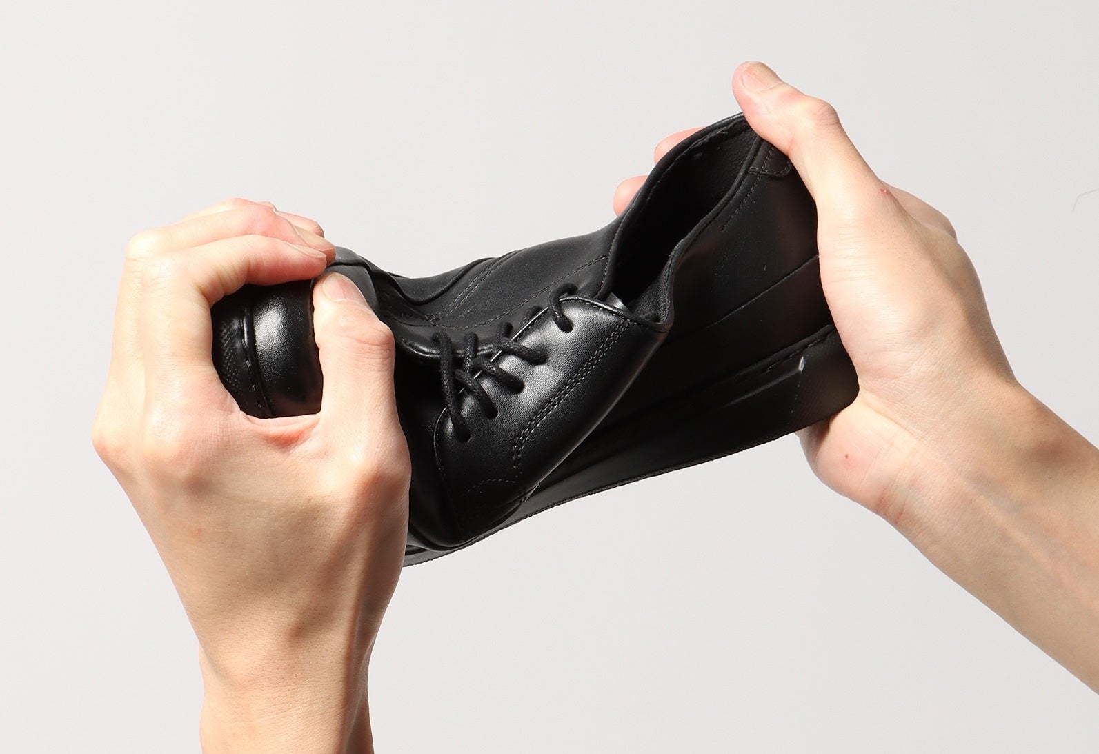 ソール・表面部分共に屈曲性があり柔らかい仕様となっています。また、一般的な革のビジネスシューズが片足約400~500gに対し、この企画はプレーントゥで242gと軽量なことに加え、緩衝性のあるインソールが歩行時の足への衝撃を和らげてくれるため、疲れにくい設計となっています。