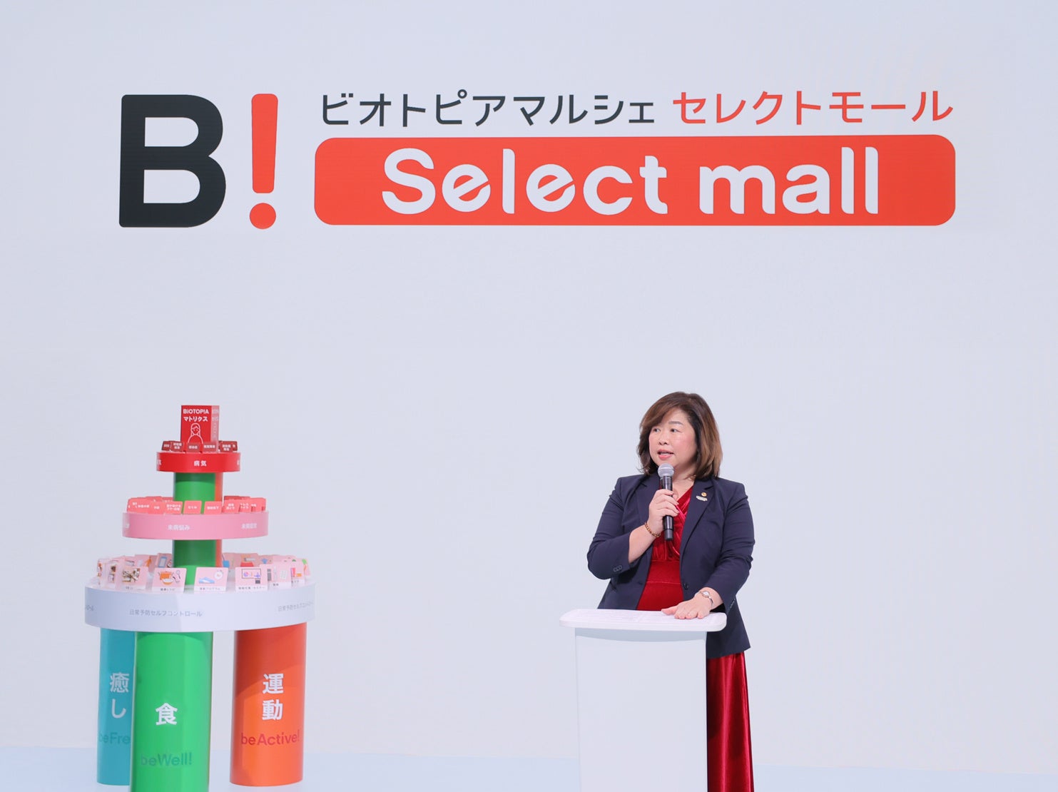 小川は、「弊社のウェルネス市場での新しいサービスを、そして、日本中のものづくりを行う企業様・事業者様に新しい販路の朗報をお届けするためこの場を設けさせていただいた」とコメント。経営理念“双方向性情報事業の展開を通じて、心の安らぎとアメニティを提供する”に基づき展開するブルックスグループ。強みである通信販売からの業態開発の延長としての未病改善プロジェクト「ビオトピアマルシェ セレクトモール」の道のりと社会背景について説明しました。「これからの日本の健康寿命を延伸していくべく、弊社と想いや熱意を共にする生産者様・メーカー様とウェルネス商材・サービスの一大プラットフォームを創造して参ります」と「ビオトピアマルシェ セレクトモール」グランドオープンを宣言しました。