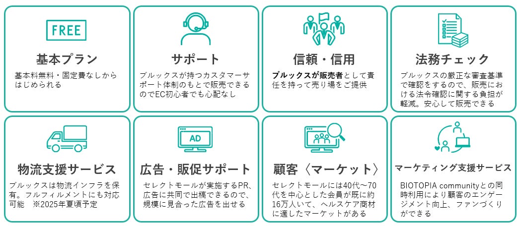 当モールでは、弊社が提唱する「ビオトピアマトリクス(※2)」に沿って、ヘルスケアに携わる様々な生産者様が開発・製造・生産した健康商材を直接出品していただき、全ての商品を当社独自の基準で審査を行った上で販売しております。従来の価格重視型のモールとは異なり、より「作り手の熱意」と「日常の健康維持・増進」をお届けできるサイトを目指し、健全なヘルスケア市場の成長を後押しするべく、独自性と付加価値を有したECモールへと発展してまいります。