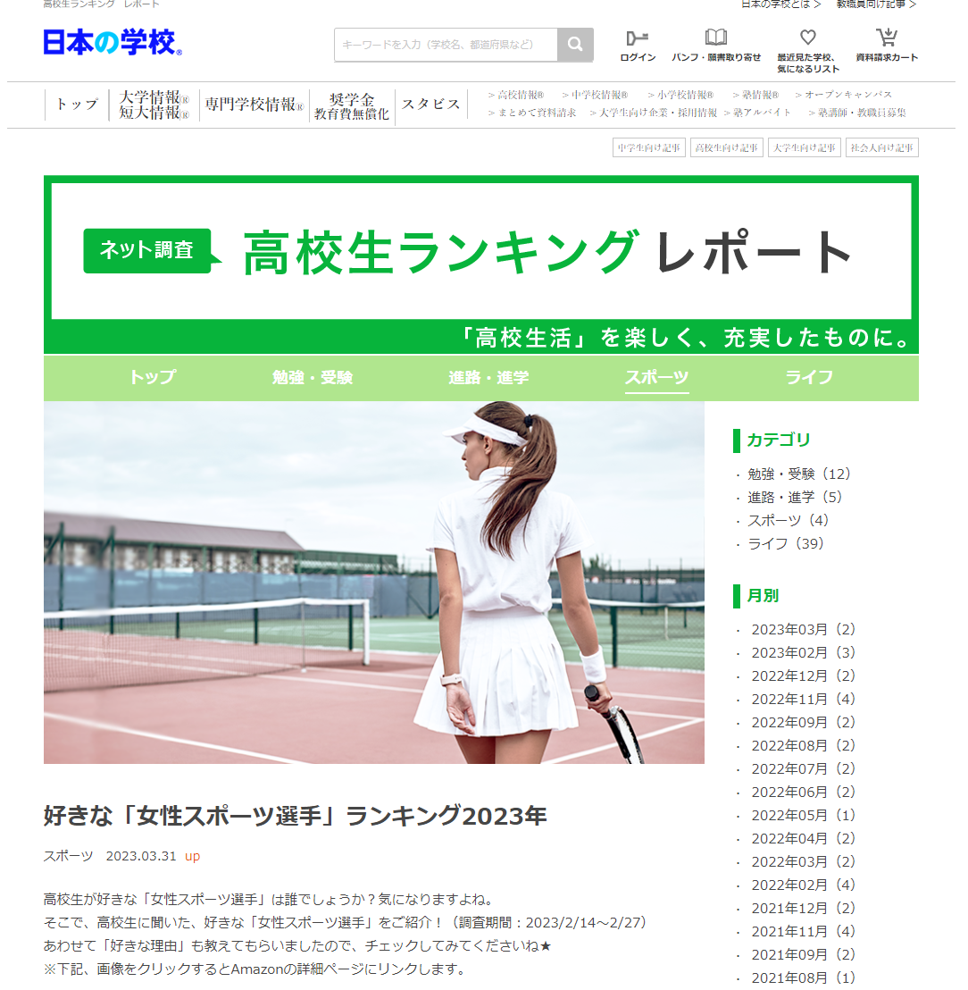 高校生ランキングレポート「好きな「女性スポーツ選手」ランキング2023年」:https://school.js88.com/koukousei/life/62