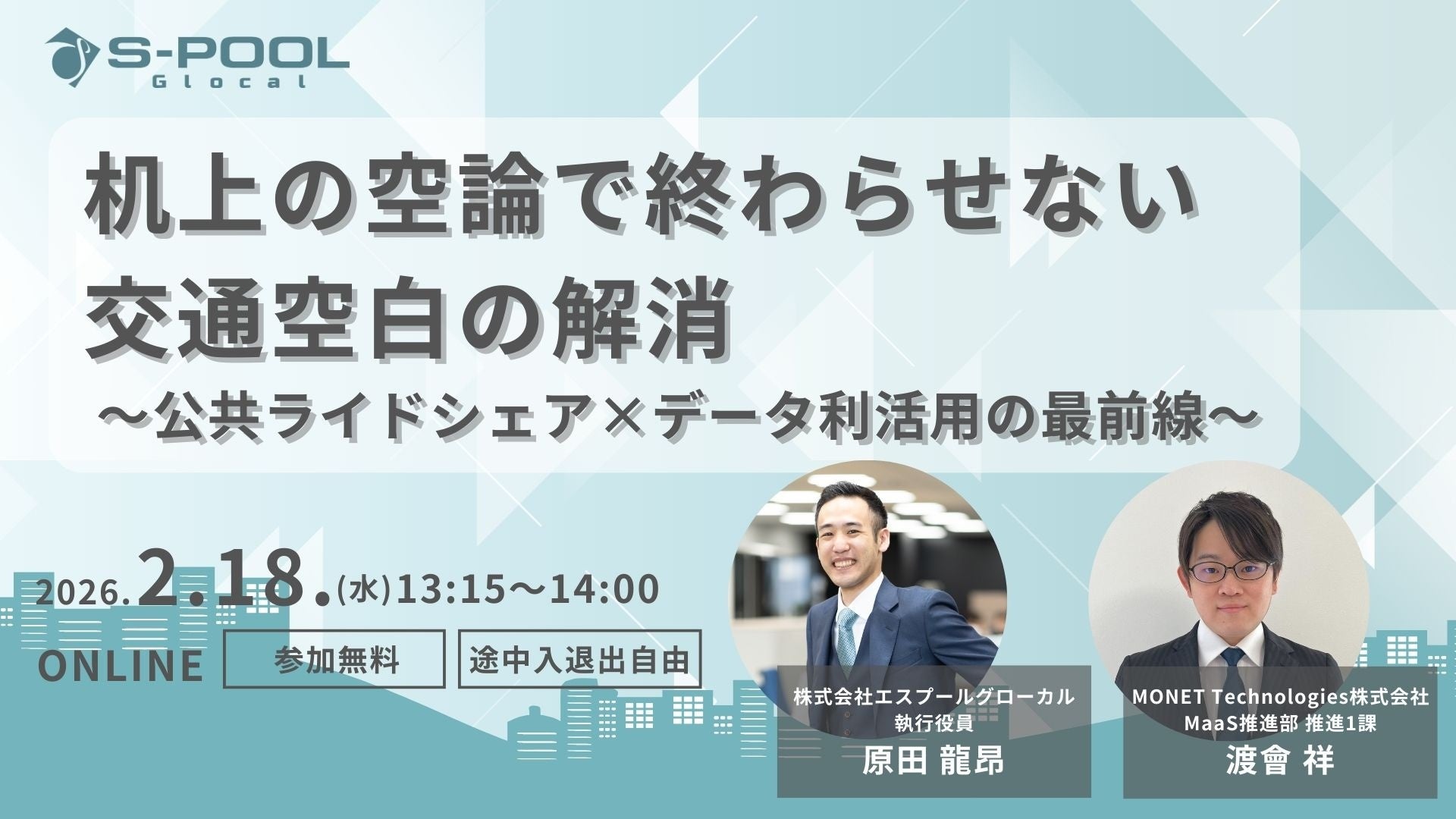 株式会社エスプールグローカル(本社:東京都千代田区、社長執行役員:佐久間 雄介、以下「当社」)は、MONET Technologies株式会社(本社:東京都千代田区、代表取締役社長 兼 CEO:清水 繁宏、以下「MONET Technologies」)と共同で、自治体の交通担当者様を対象としたウェビナー「机上の空論で終わらせない交通空白の解消 〜公共ライドシェア×データ利活用の最前線〜」を、2026年2月18日(水)に開催いたします。
