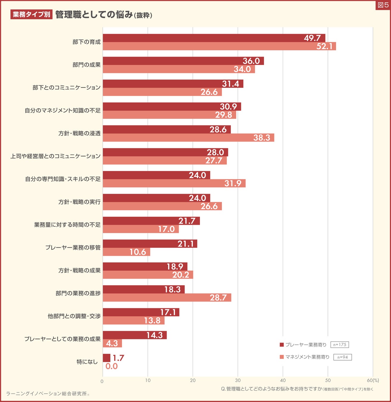 最大の悩みは「部下の育成」で、51.0%と半数以上が回答。次に「部門の成果」が34.7%、「方針・戦略の浸透」が32.5%と続きました(図1)。